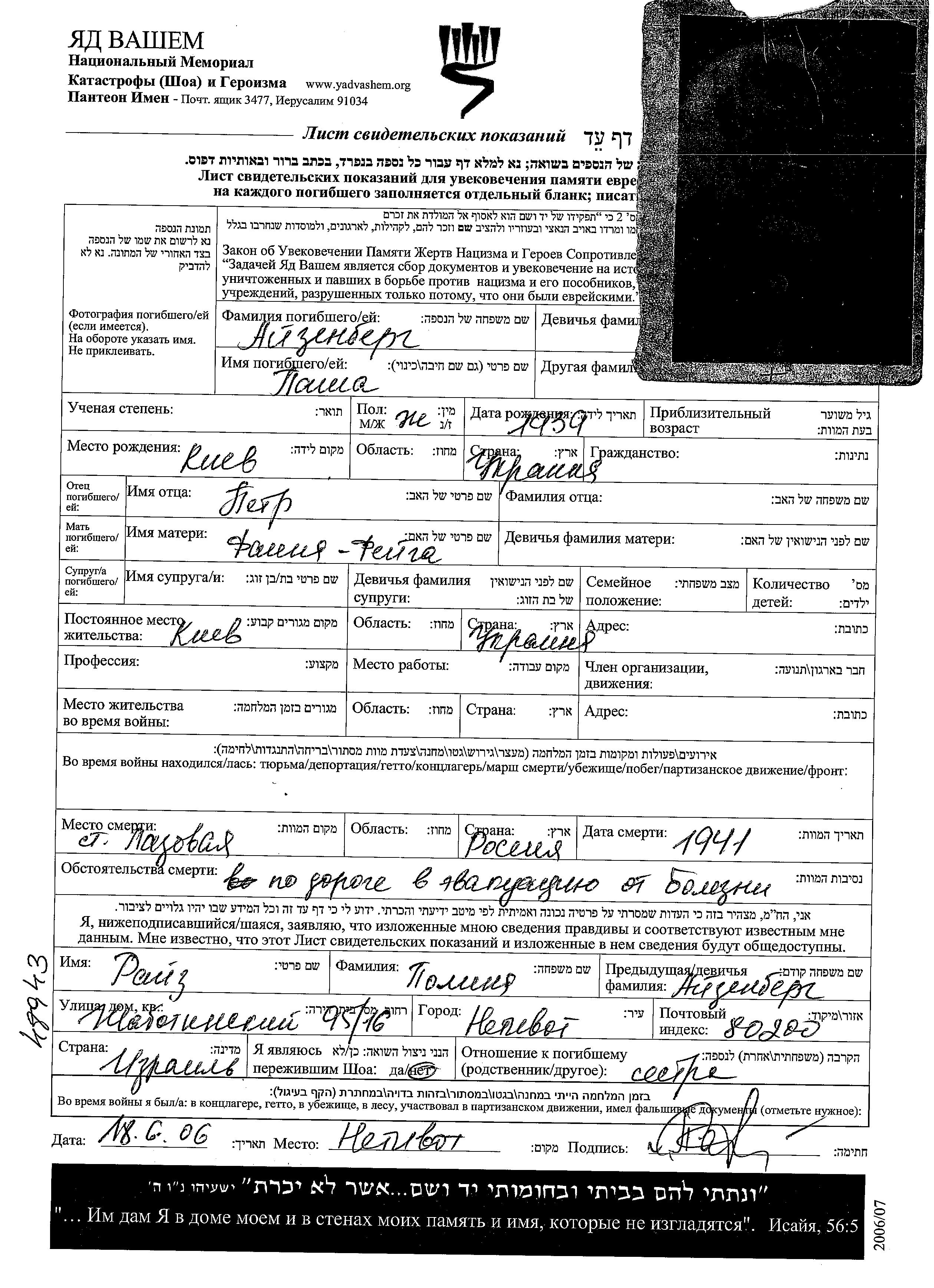 Yad Vashem - Pages of Testimony Names Memorial Collection