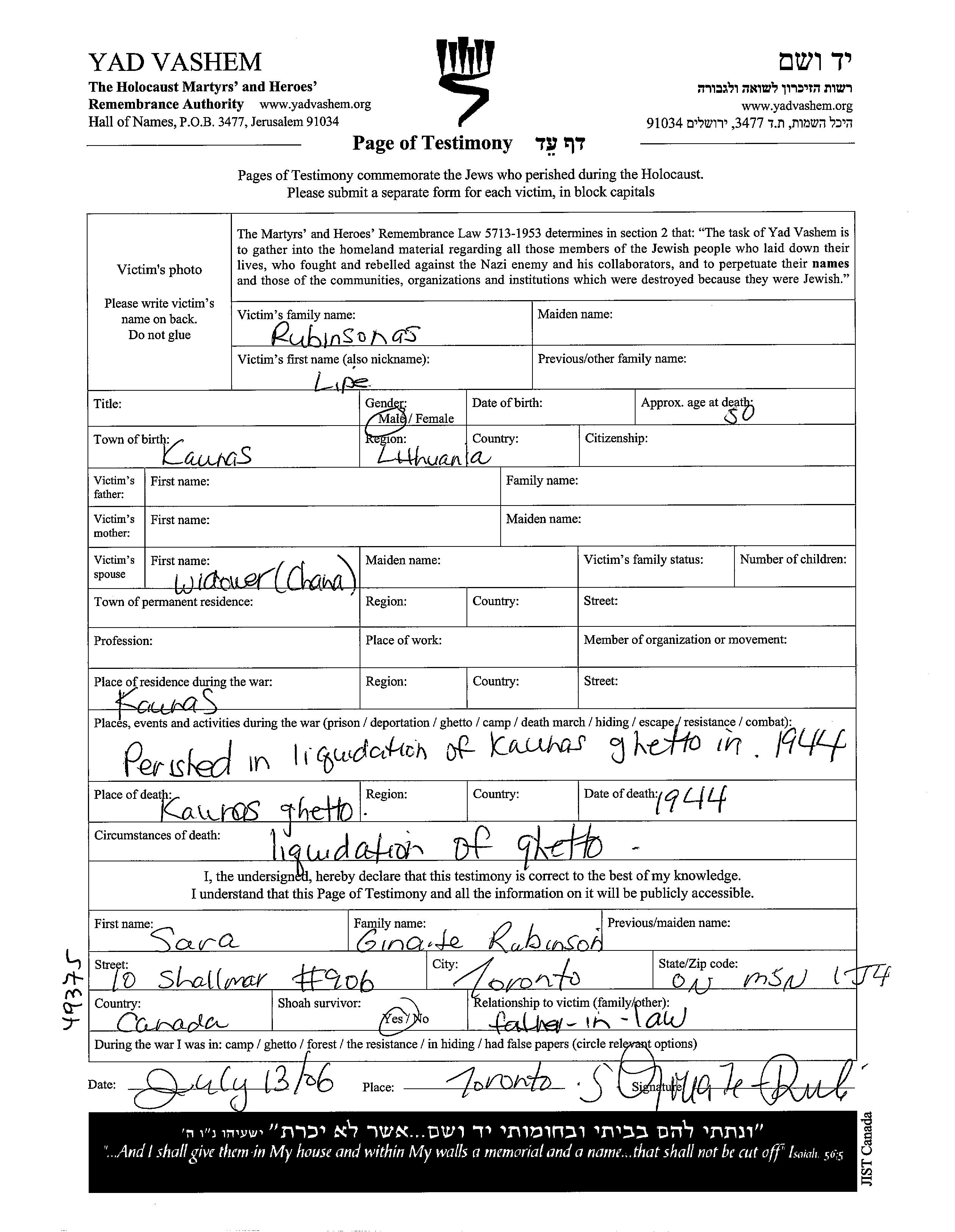 Rubinsonas Lipe Kaunas, Lithuania Page of Testimony