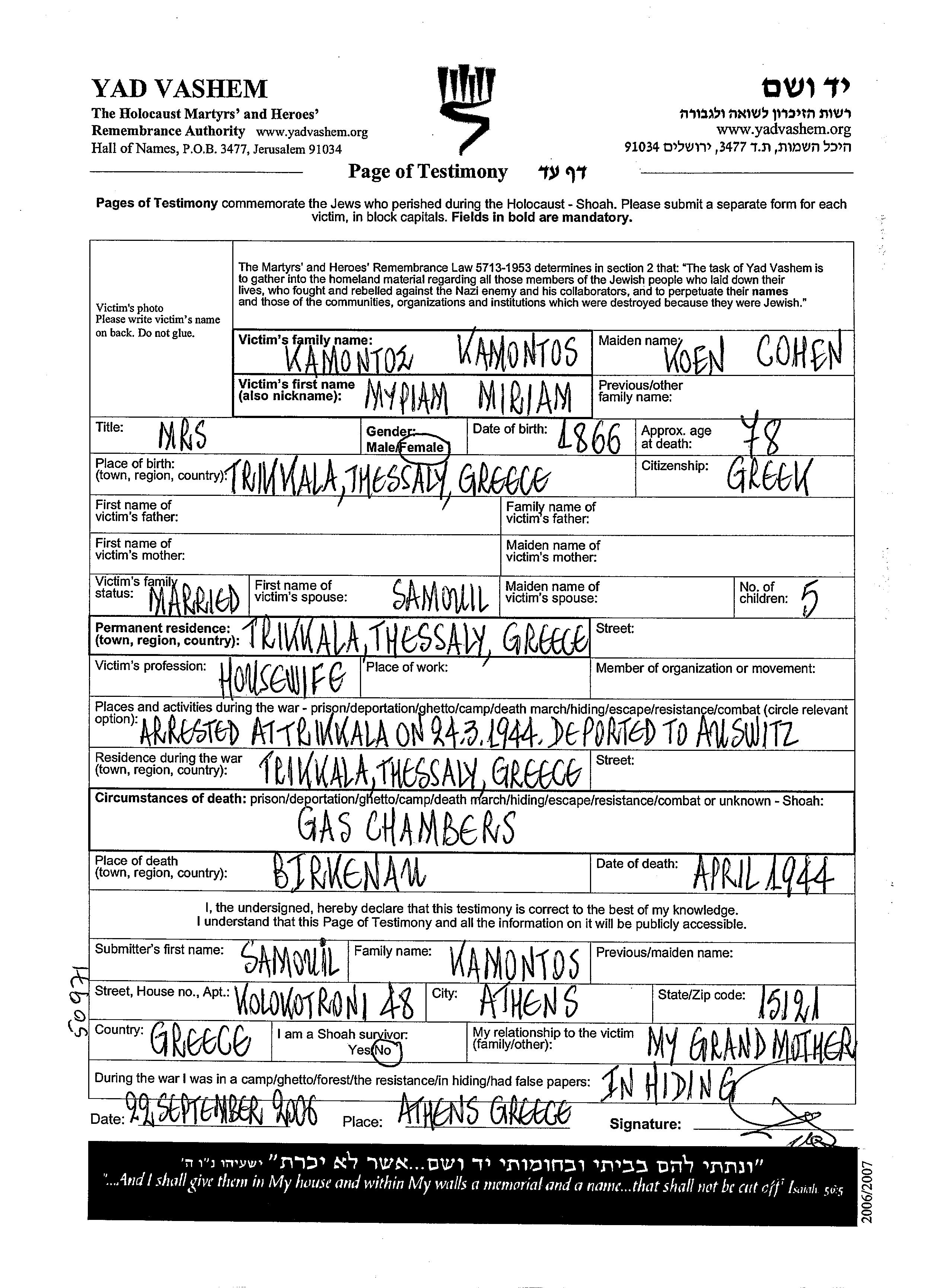 Kamontos Miriam 1866 Trikkala, Greece Page of Testimony