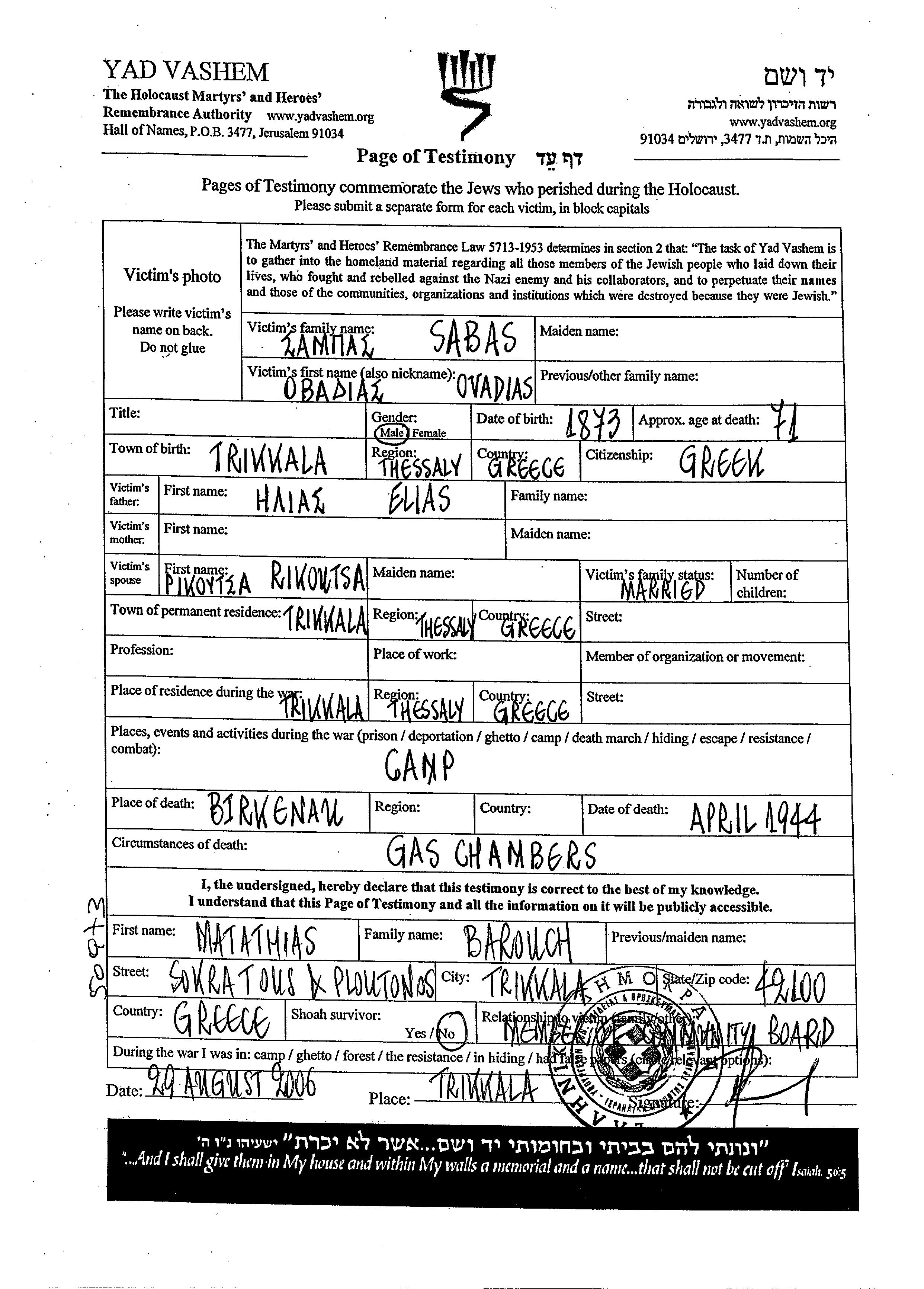 Sabas Ovadias 1873 Trikkala, Greece Page of Testimony