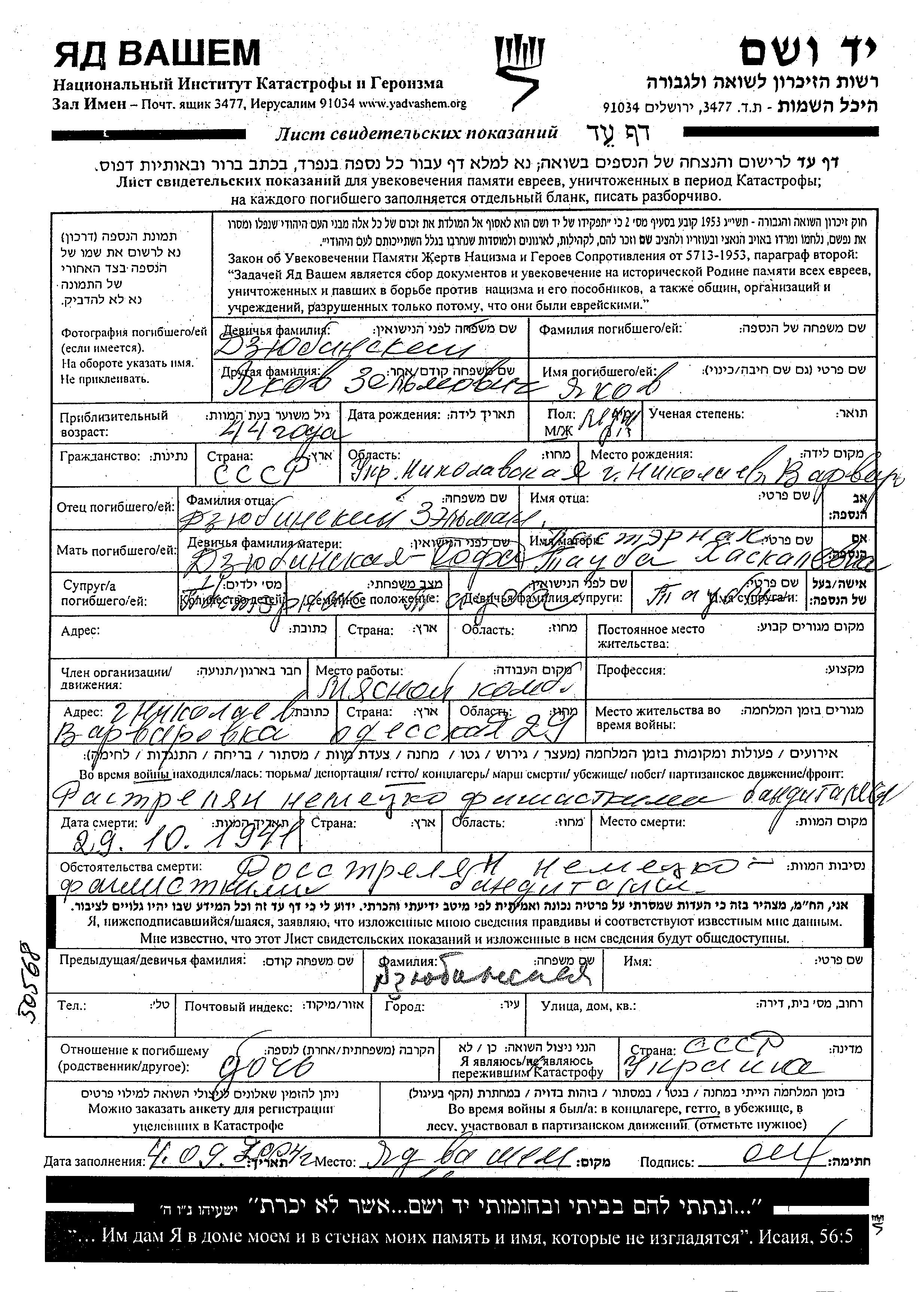 Yakov Dzyubinski was born in Varvarovka, Ukraine (USSR) to Zelman and Sofa. He was married to Tauba nee Pasternak. Prior to WWII he lived in Varvarovka, Ukraine (USSR). During the war he was in Ghetto. Yakov was murdered in the Shoah. Place of death: Varvarovka, Ukraine (USSR), 29/10/1941.