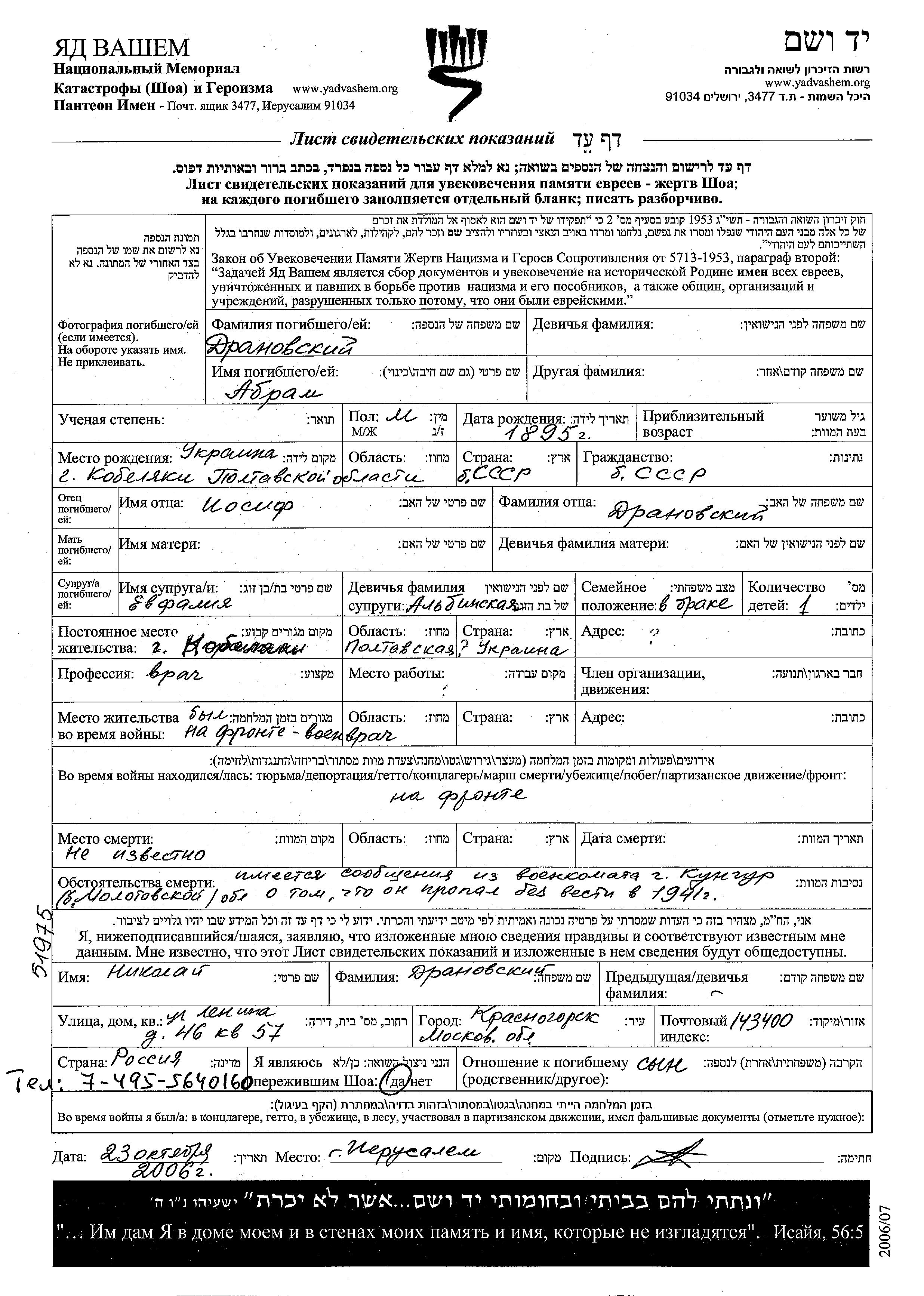 Dranovski Abram 1895 Kobelyaki, Ukraine (USSR) Page of Testimony