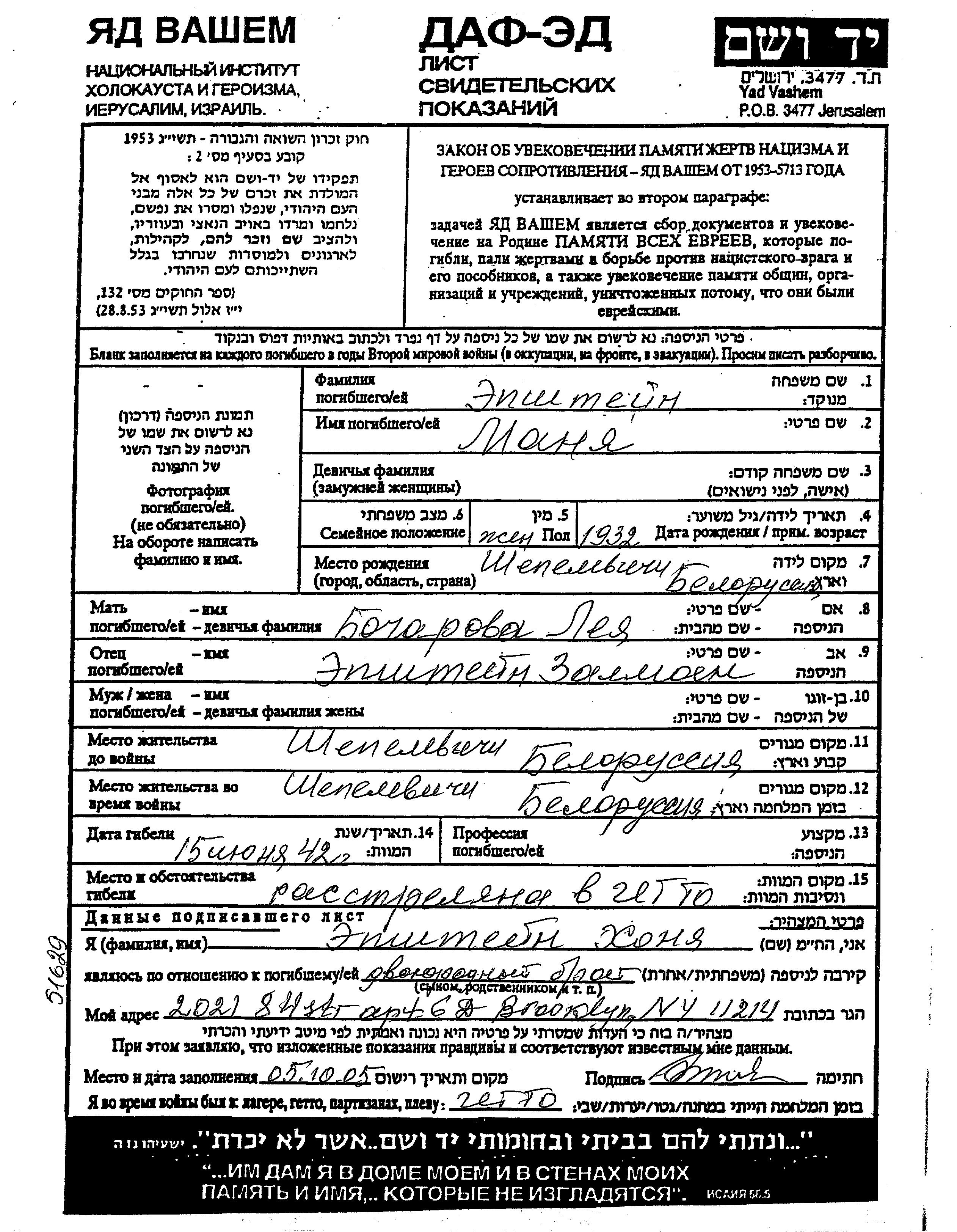 Manya Epshtein was born in Shepelevichi, Belorussia (USSR), 1932 to Zalman and Lea nee Bocharova. She was child. Prior to WWII she lived in Shepelevichi, Belorussia (USSR). During the war she was in Shepelevichi, Belorussia (USSR). Manya was murdered in the Shoah. Place of death: Shepelevichi, Belorussia (USSR), 15/06/1942.