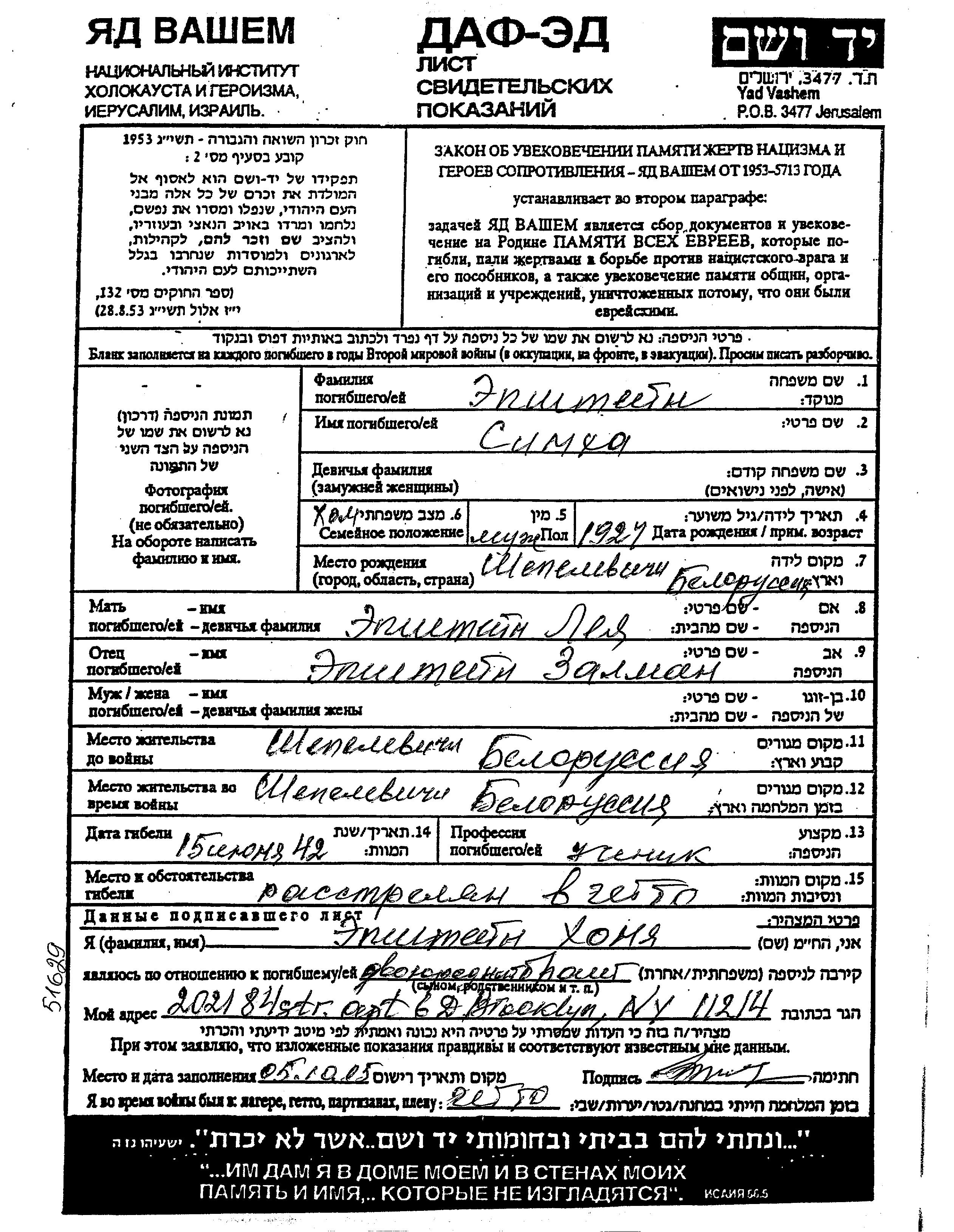 Simkha Epshtein was born in Shepelevichi, Belorussia (USSR), 1924 to Zalman and Lea. He was a pupil and single. Prior to WWII he lived in Shepelevichi, Belorussia (USSR). During the war he was in Shepelevichi, Belorussia (USSR). Simkha was murdered in the Shoah. Place of death: Ghetto, Belorussia (USSR), 15/06/1942.
