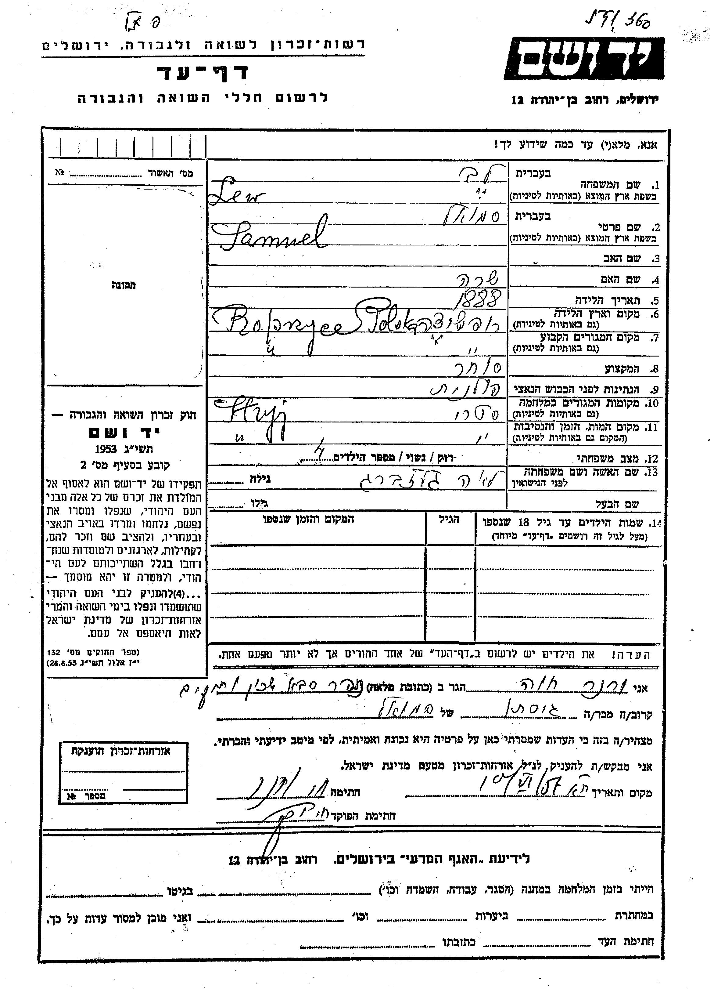 Lew Samuel 1888 Ropchitse, Poland Page of Testimony