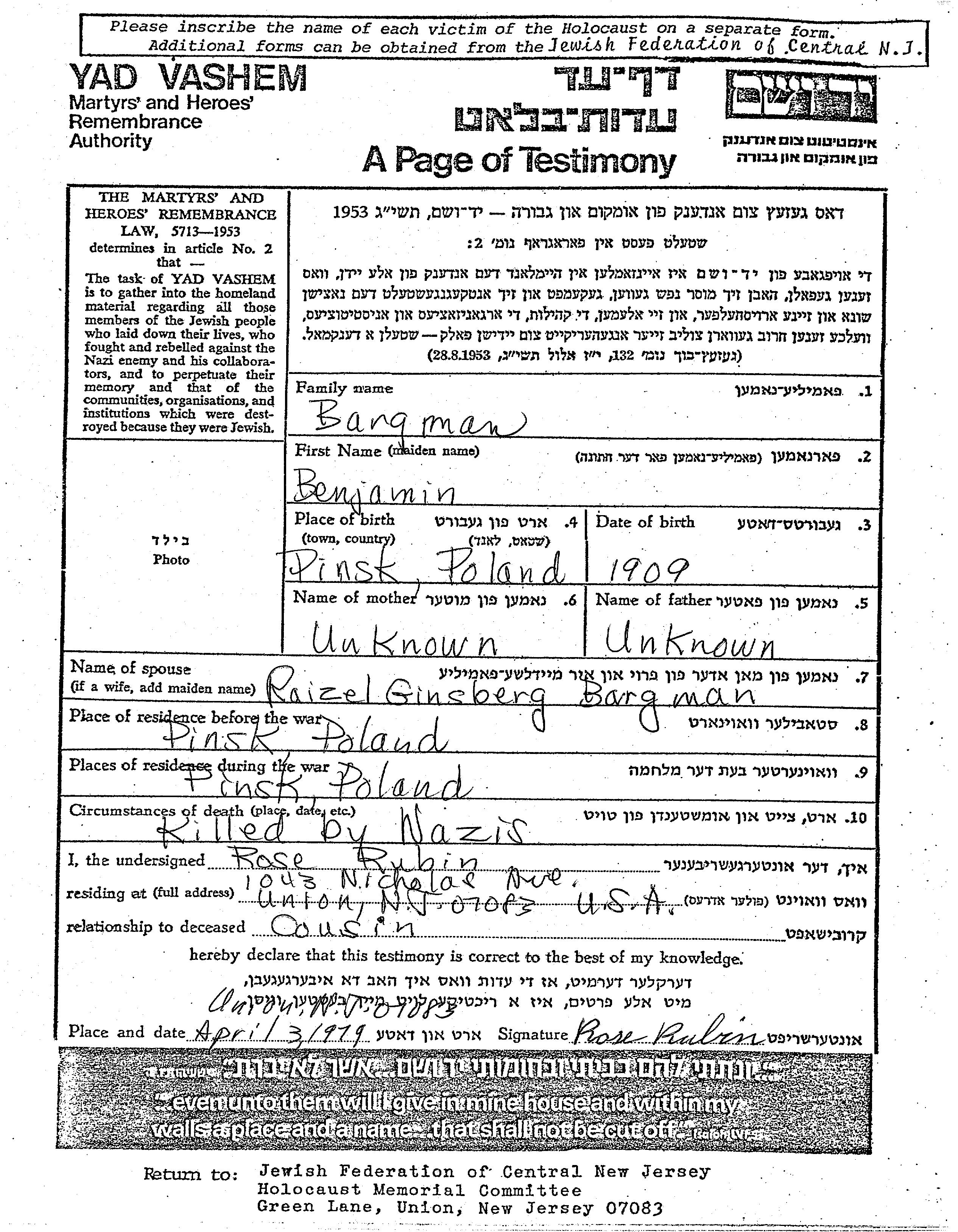 Benjamin Bargman was born in Pinsk, Poland, 1909. He was married to Raizel nee Ginsberg. Prior to WWII he lived in Pinsk, Poland. During the war he was in Pinsk, Poland. Benjamin was murdered in the Shoah.