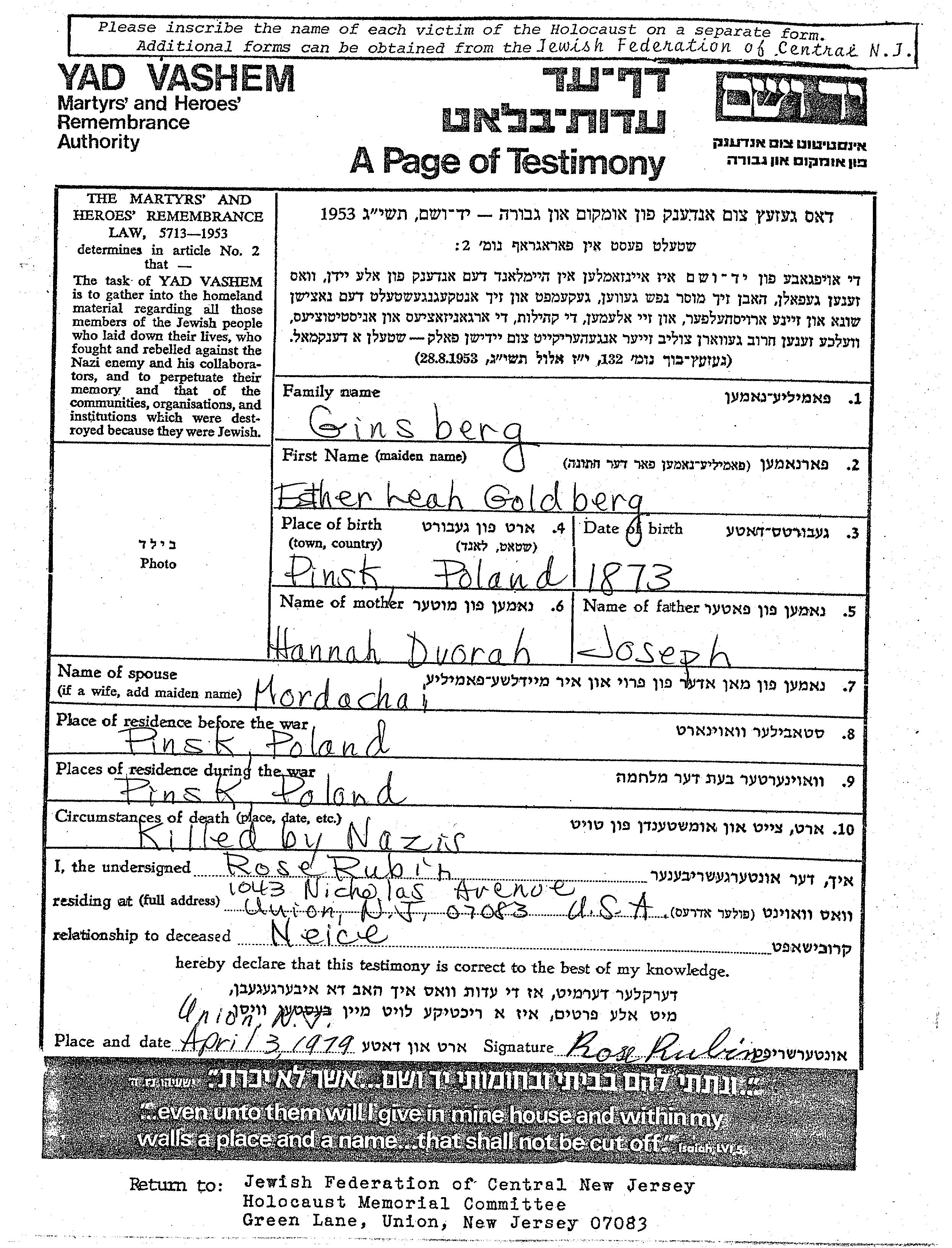 Esther Leah Ginsberg nee Goldberg was born in Pinsk, Poland, 1873 to Joseph and Hannah Dvorah. She was married to Mordachai. Prior to WWII she lived in Pinsk, Poland. During the war she was in Pinsk, Poland. Esther Leah was murdered in the Shoah.