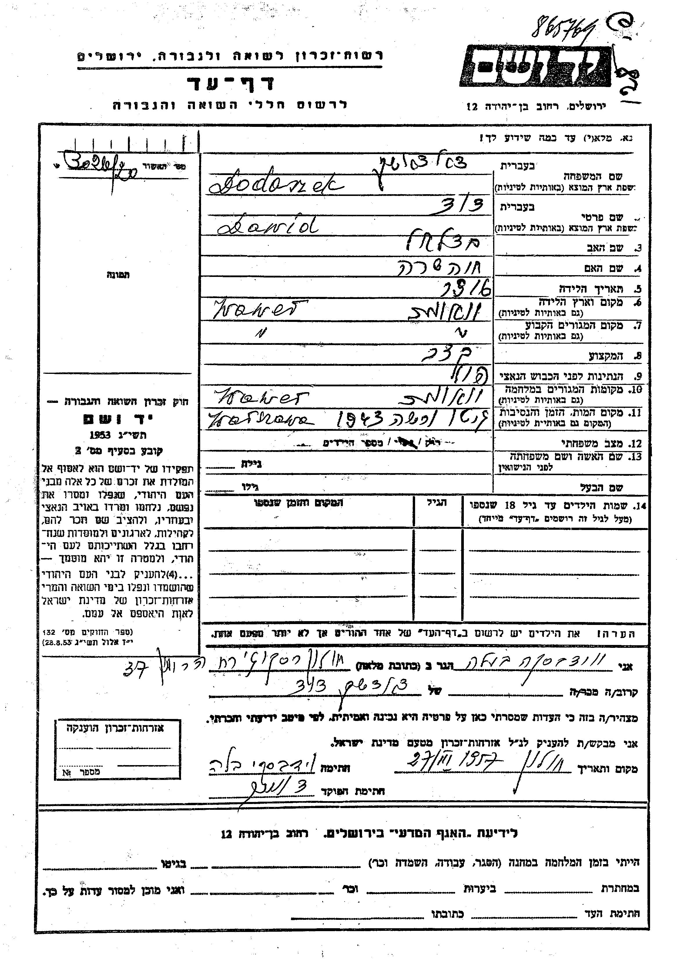 Dawid Dodoszek was born in Wawer, Poland, 1916 to Betzalel and Khava Sara. He was a butcher and single. Prior to WWII he lived in Wawer, Poland. During the war he was in Wawer, Poland. Dawid was murdered in the Shoah. Place of death: Warszawa, Poland, 1943.