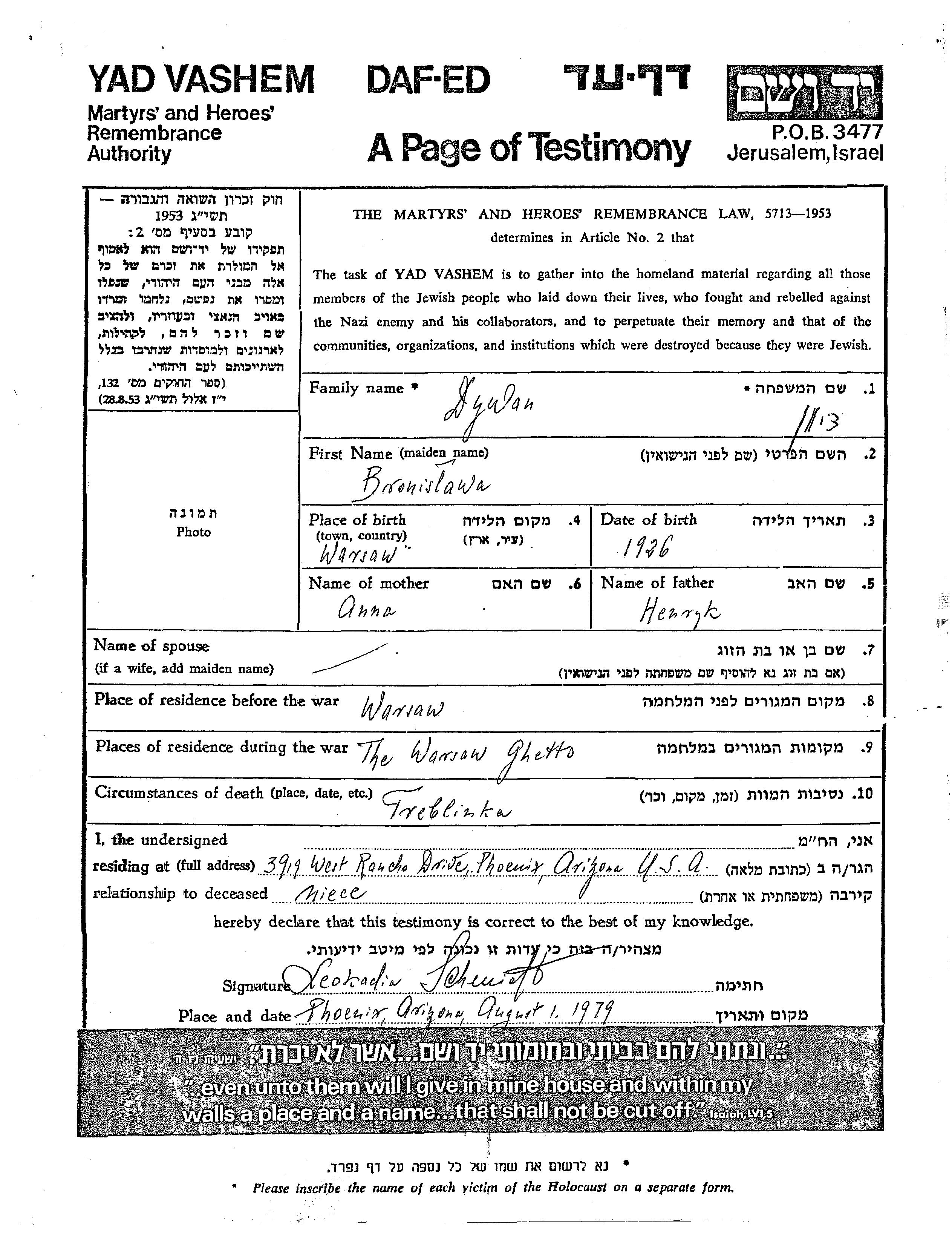 Bronislawa Dywan was born in Warsaw, Poland, 1926 to Henryk and Anna. Prior to WWII she lived in Warsaw, Poland. During the war she was in Warsaw, Poland. Bronislawa was murdered in the Shoah. Place of death: Treblinka, Poland.