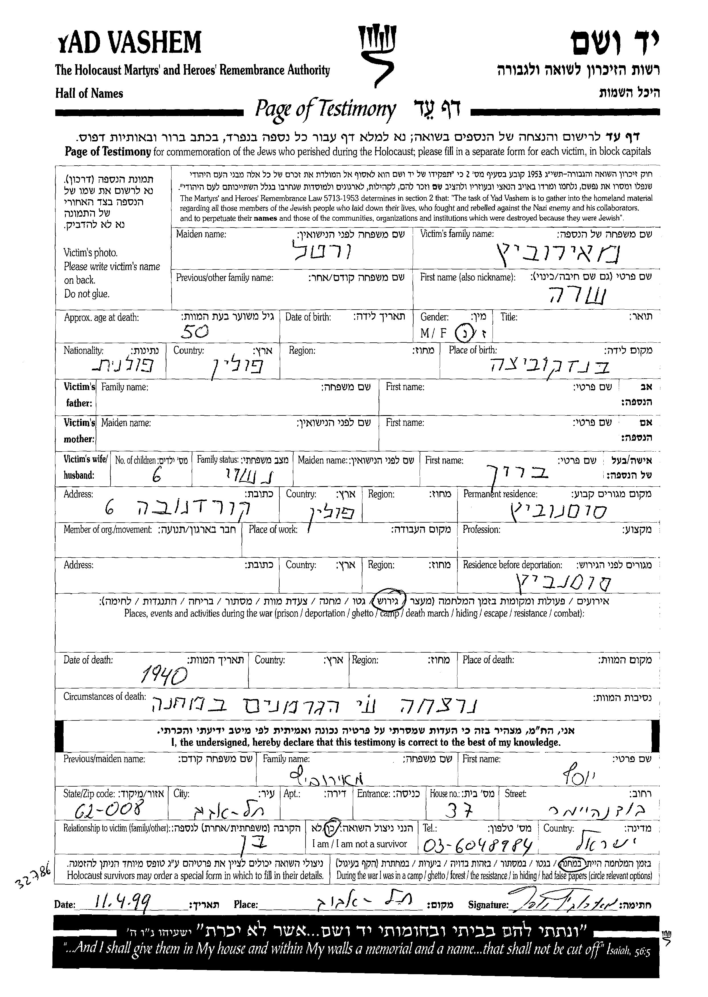 Sara Meirovitz nee Vertel was born in Bedkowice, Poland. She was married to Barukh. Prior to WWII she lived in Sosnowiec, Poland. During the war she was in Sosnowiec, Poland. Sara was murdered in the Shoah. Place of death: Camp, 1940.