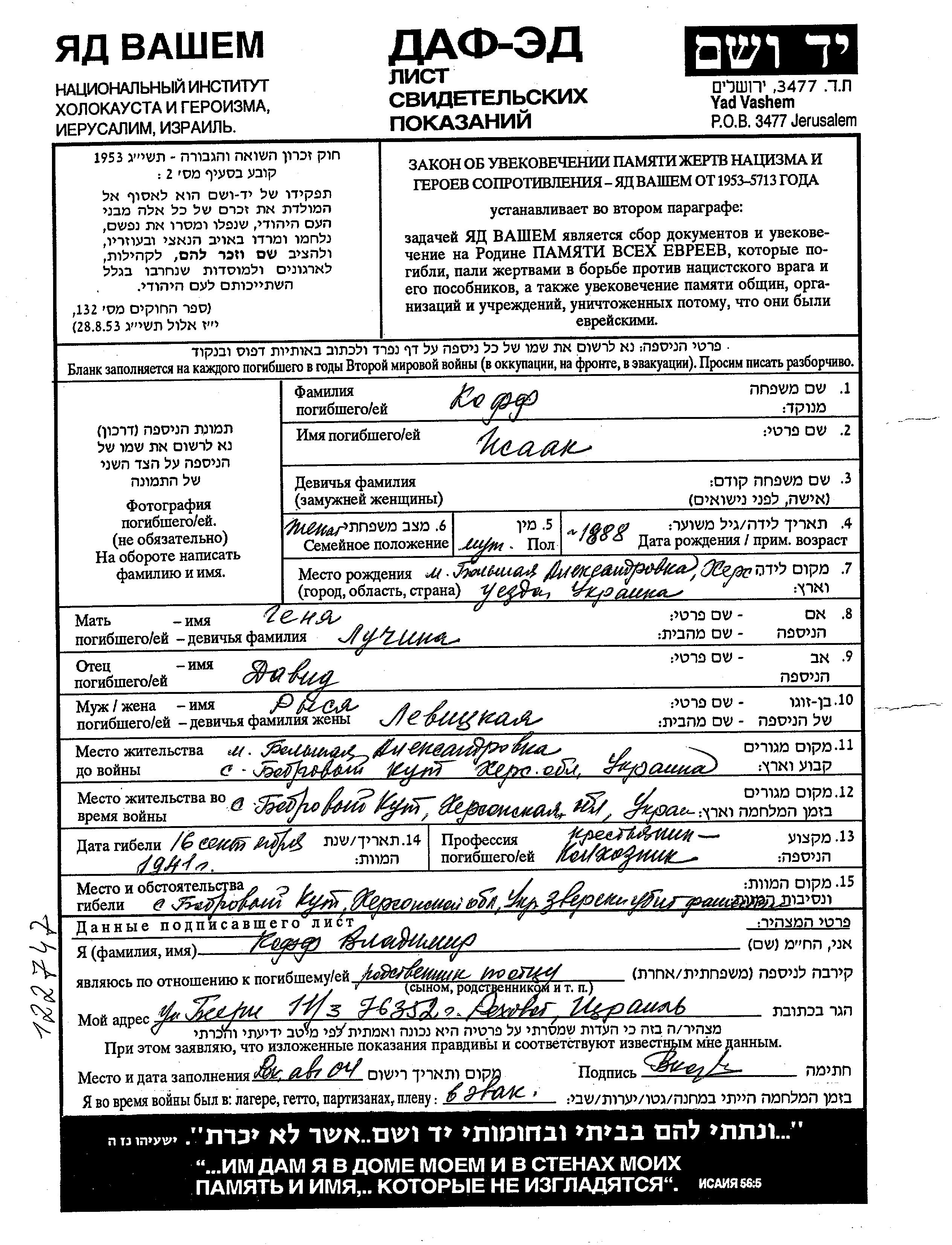 Isaak Koff was born in Bolshaya Aleksandrovka, Ukraine (USSR), 1888 to David and Genya nee Luchina. He was a kolkhoznik / kolkhoznitza and married to Rysya nee Levitzkaya. Prior to WWII he lived in Bolshaya Aleksandrovka, Ukraine (USSR). During the war he was in Bobrovyy Kut, Ukraine (USSR). Isaak was murdered in the Shoah. Place of death: Bobrovyy Kut, Ukraine (USSR), 16/09/1941.