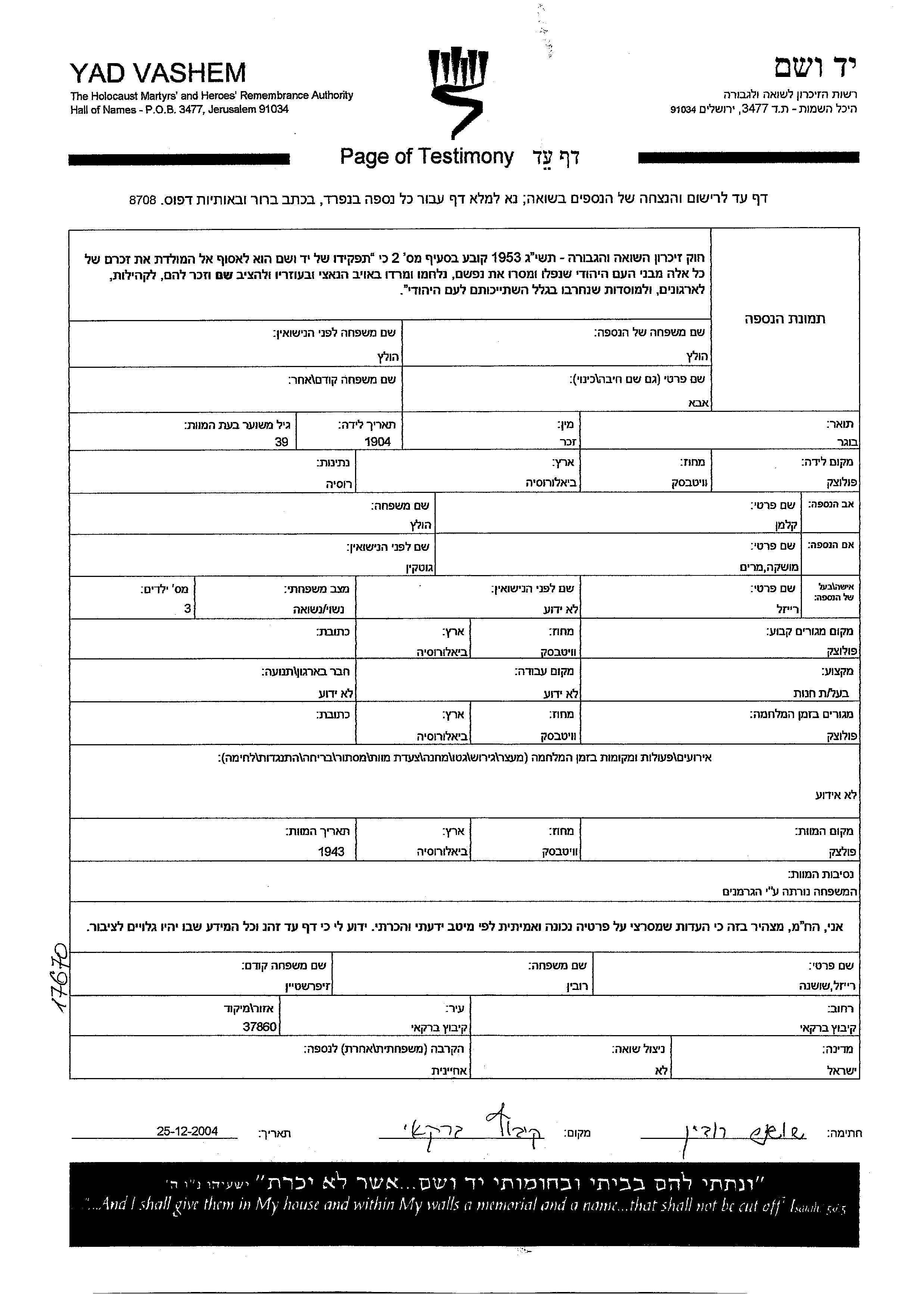 B.a. Aba Holtz was born in Polotsk, Belorussia (USSR), 1904 to Kalman and Muszke nee Gutkin. He was a shop owner and married to Reizl. Prior to WWII he lived in Polotsk, Belorussia (USSR). During the war he was in Polotsk, Belorussia (USSR). B.a. Holtz was murdered in the Shoah. Place of death: Polotsk, Belorussia (USSR), 1943.