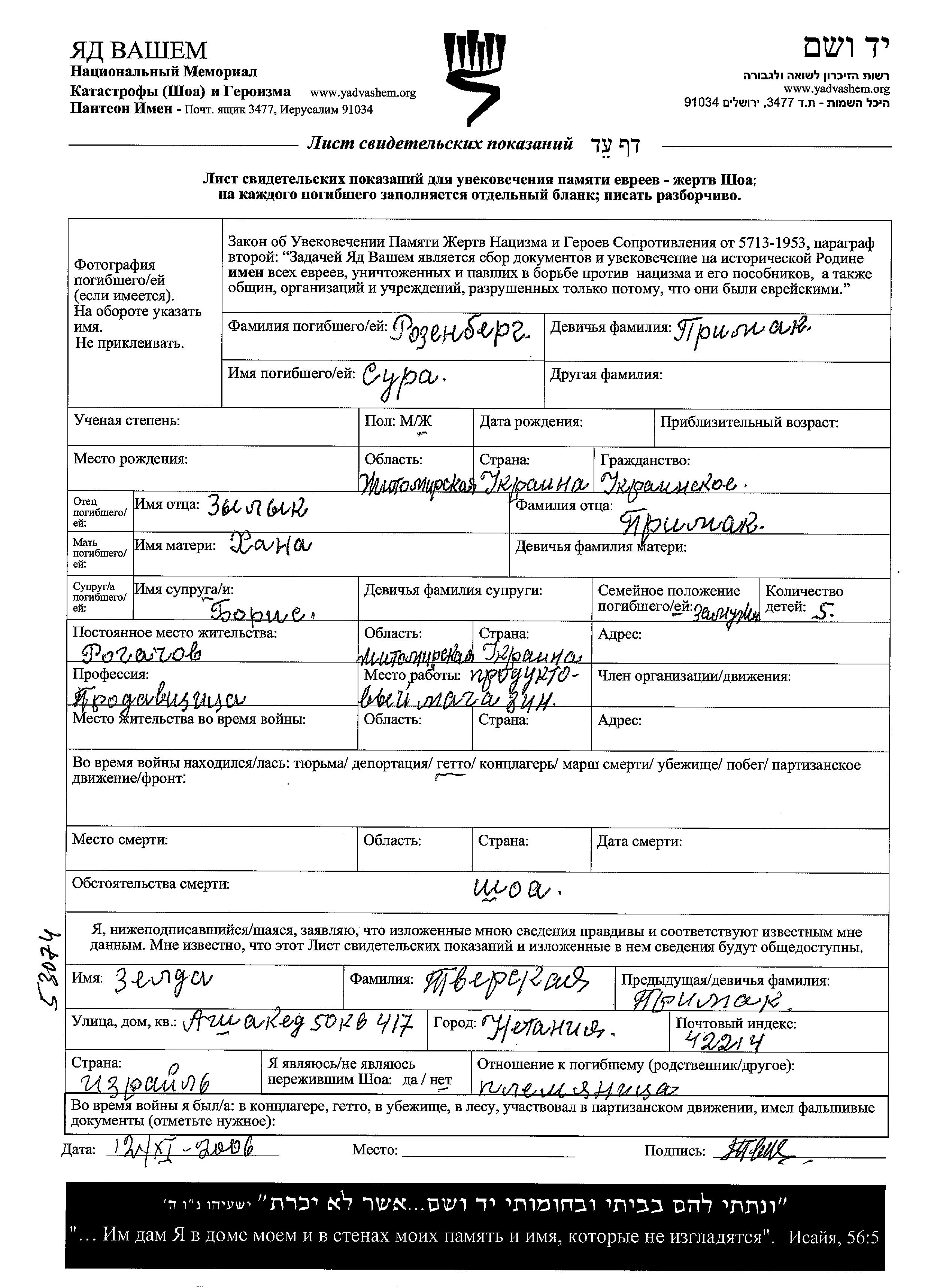 Sura Rozenberg nee Primak was born in Zhitomir, Ukraine (USSR) to Zylyk and Khana. She was a sales person and married to Boris. Prior to WWII she lived in Rogachev, Ukraine (USSR). During the war she was in Ukraine (USSR). Sura was murdered in the Shoah.
