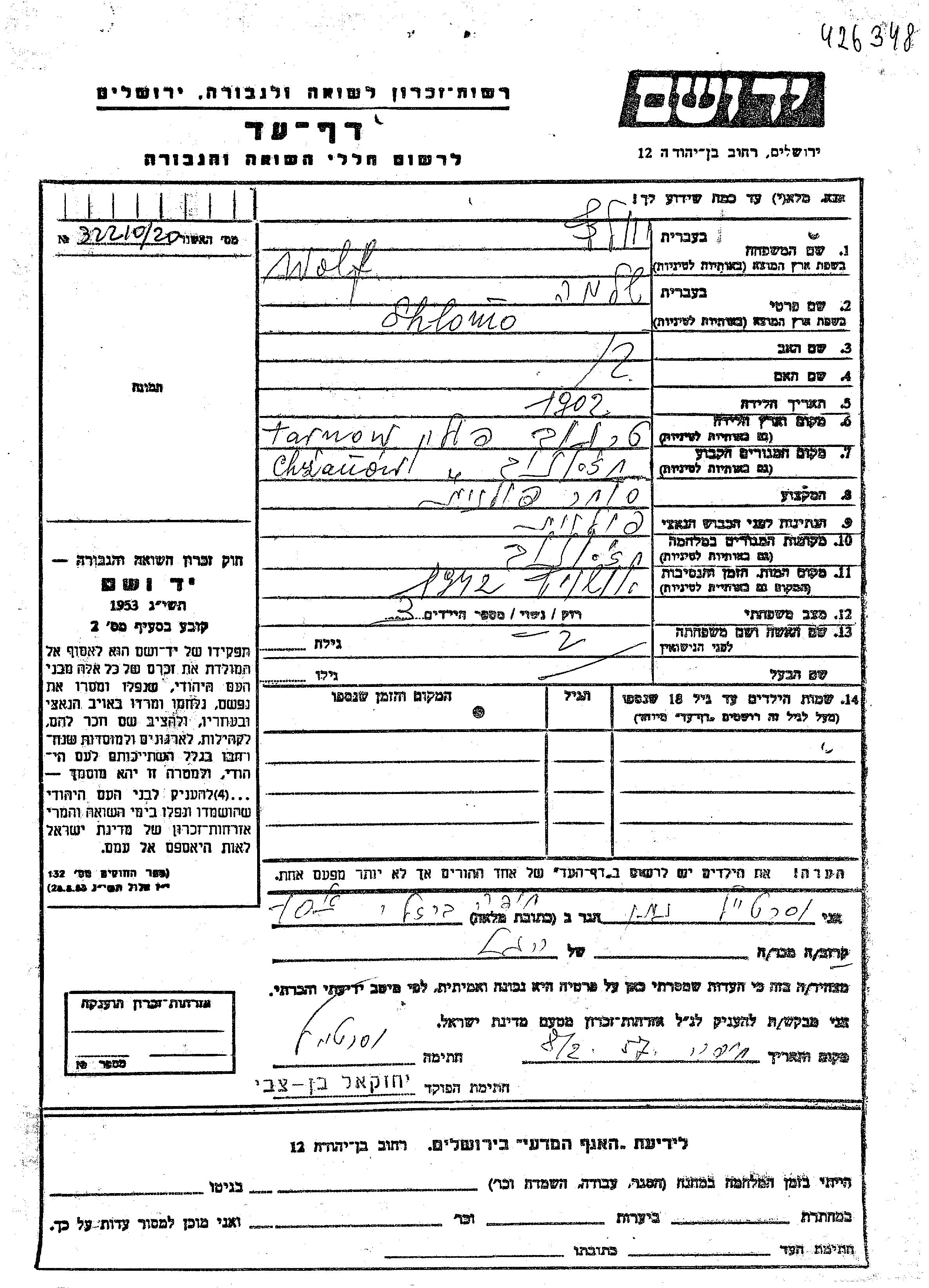 Shlomo Wolf was born in Tarnow, Poland, 1902. He was a merchant and married. Prior to WWII he lived in Chzanow, Poland. During the war he was in Chzanow, Poland. Shlomo was murdered in the Shoah. Place of death: Auschwitz, Poland, 1942.