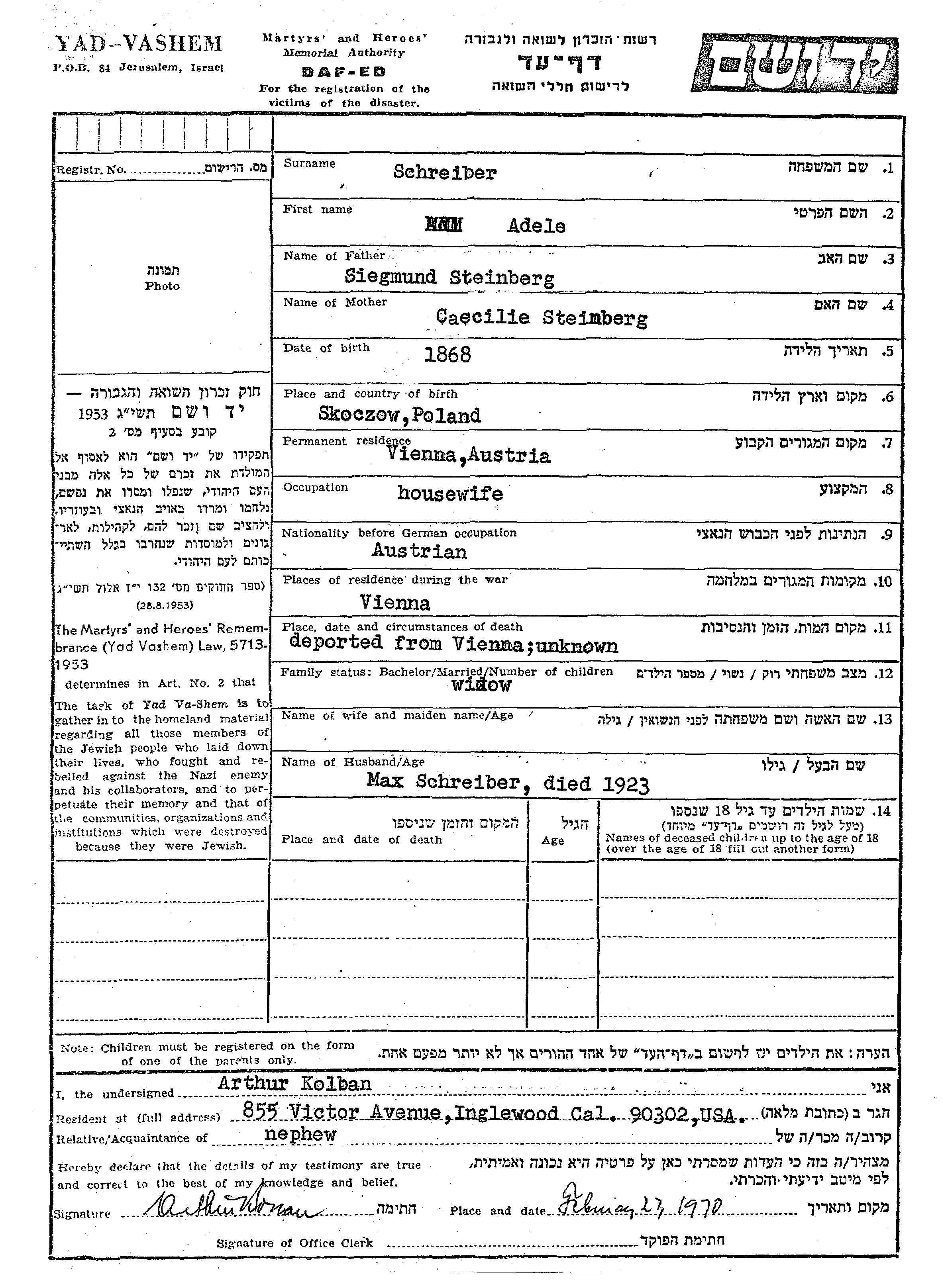 Adele Schreiber nee Steinberg was born in Skoczow, Poland, 1868 to Siegmund and Caecilie. She was a widow of Max. Prior to WWII she lived in Wien, Austria. During the war she was in Wien, Austria. Adele was murdered in the Shoah.