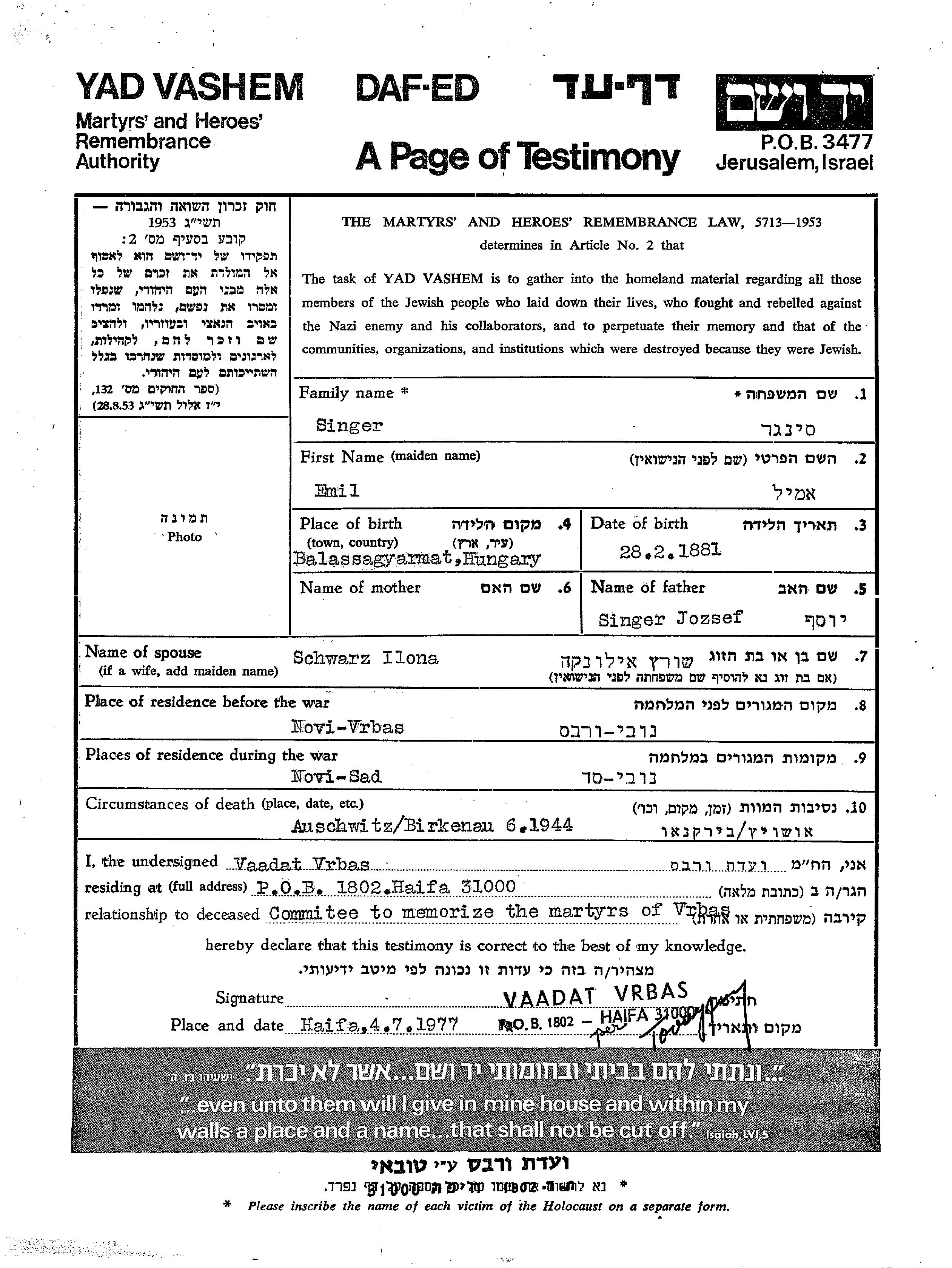 Singer Emil 1881 Novi Vrbas, Yugoslavia Page of Testimony