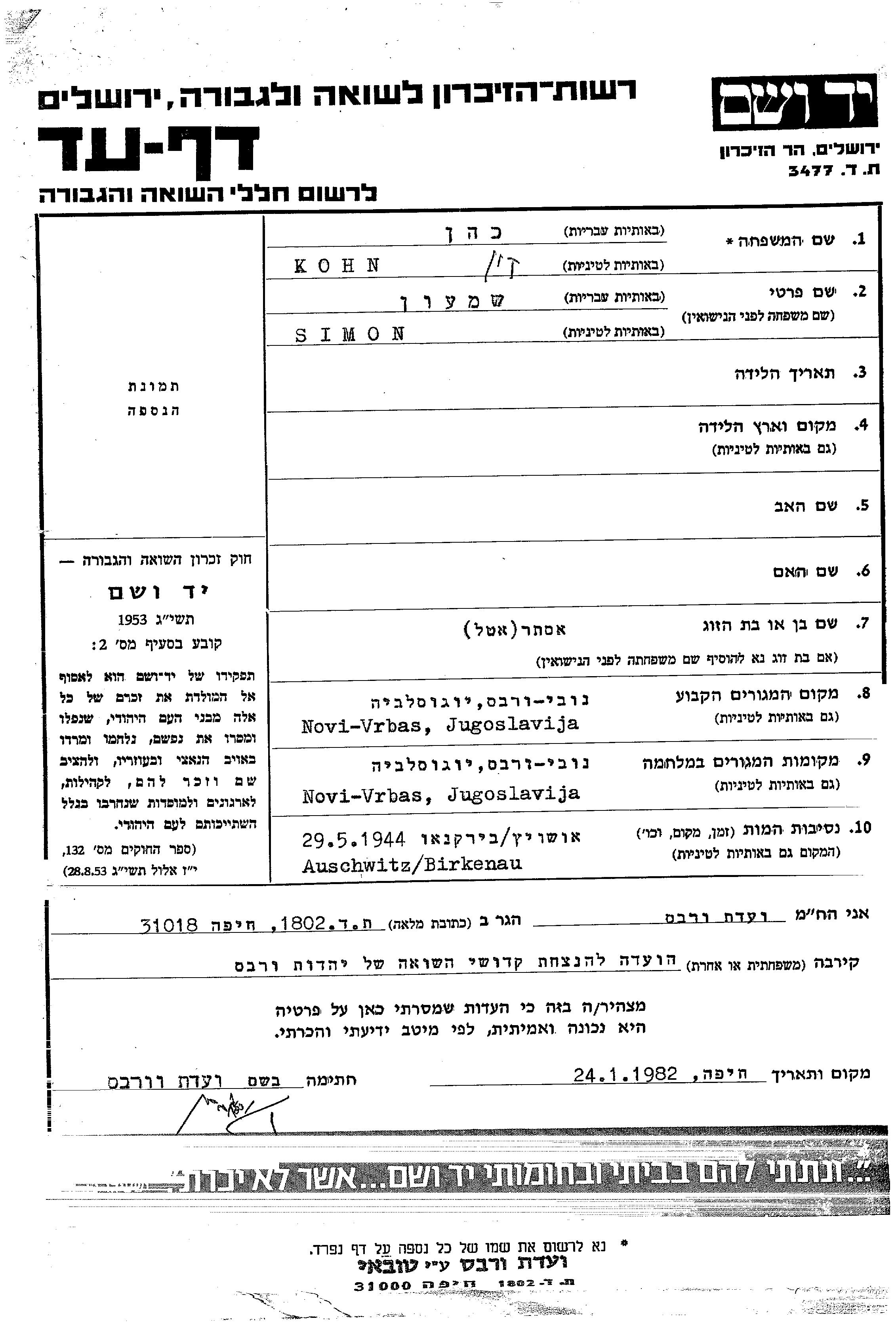 Kohn Simon Novi Vrbas, Yugoslavia Page of Testimony