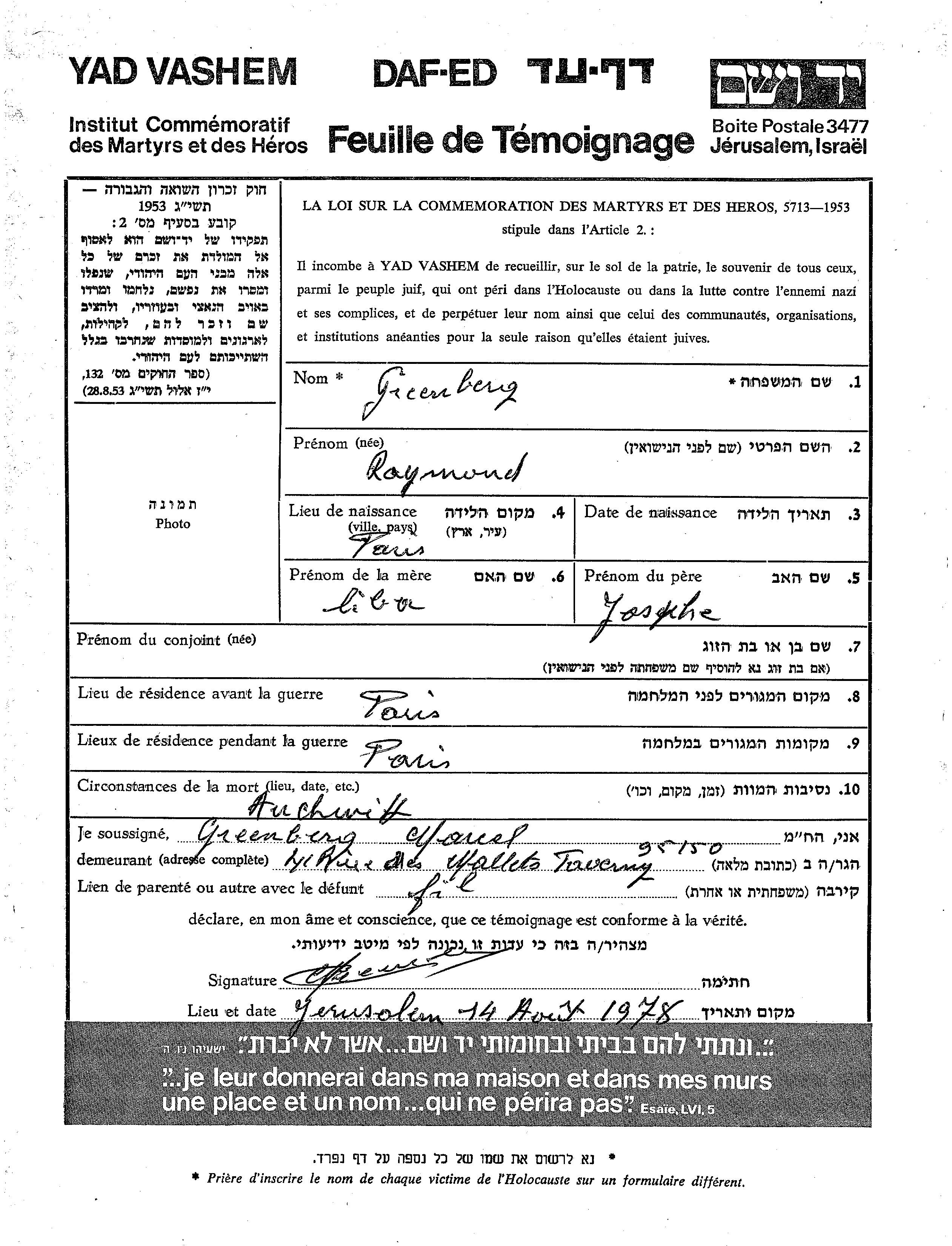 Raymond Greenberg was born in Paris, France to Josephe and Liba. Prior to WWII he lived in Paris, France. During the war he was in Paris, France.