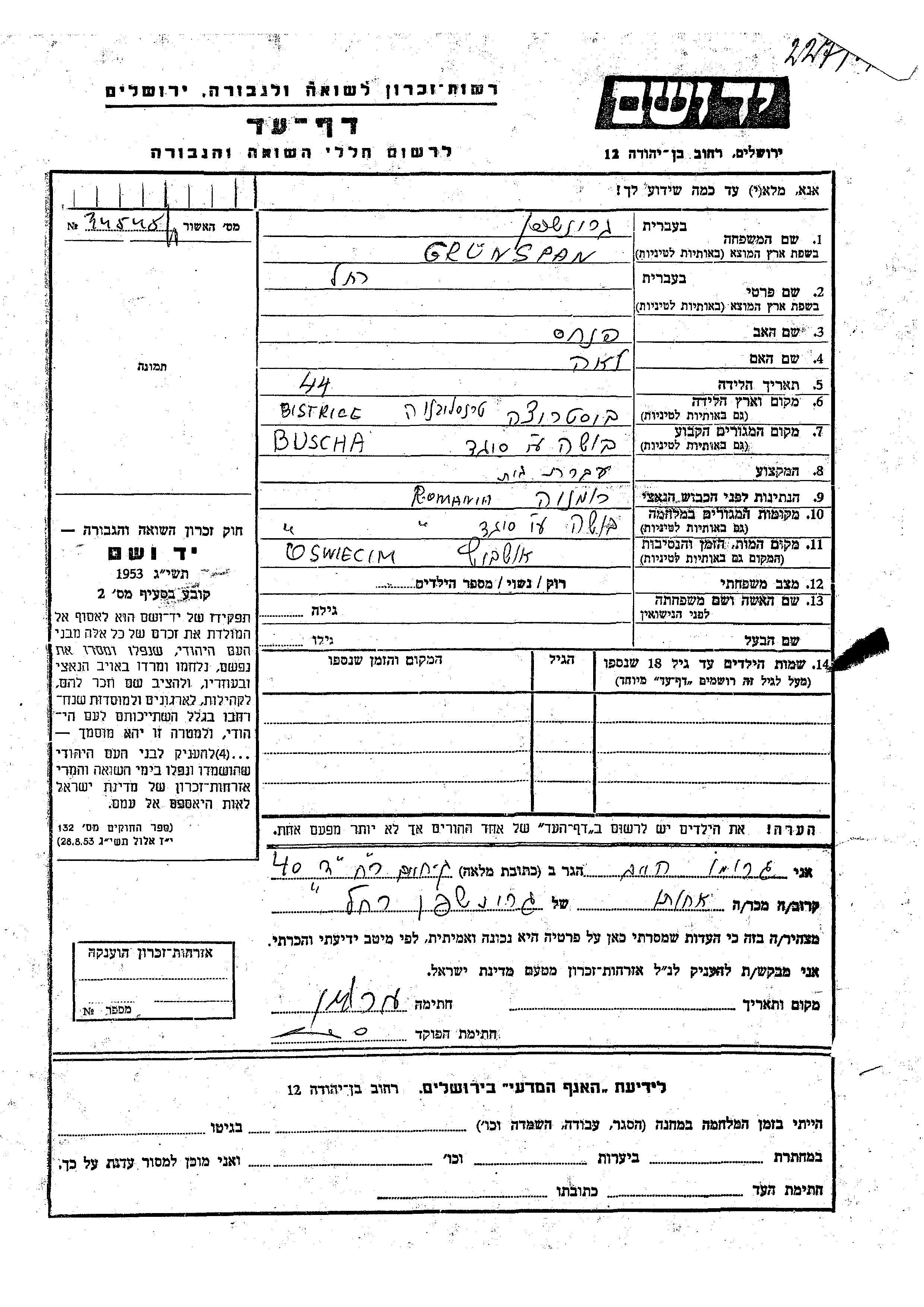 Rakhel Grunspan was born in Bistritz, Romania to Pinkhas and Lea. She was a housewife. Prior to WWII she lived in Bistrica, Romania. During the war she was in Bistrica, Romania.