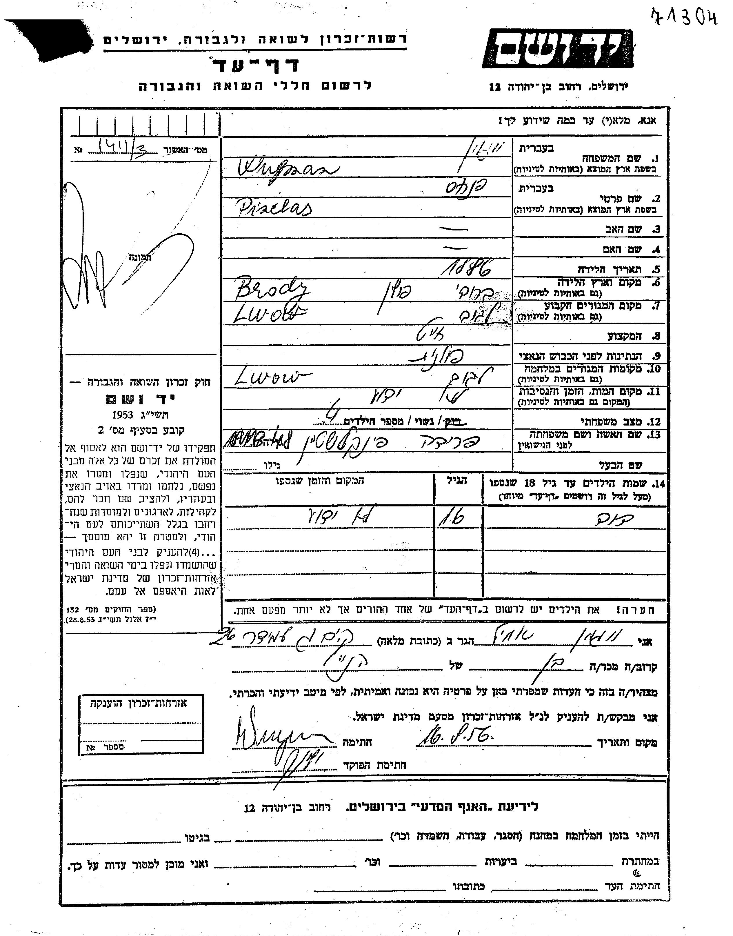 Pinchas was murdered in the Shoah. Place of death: Lwow, Poland.