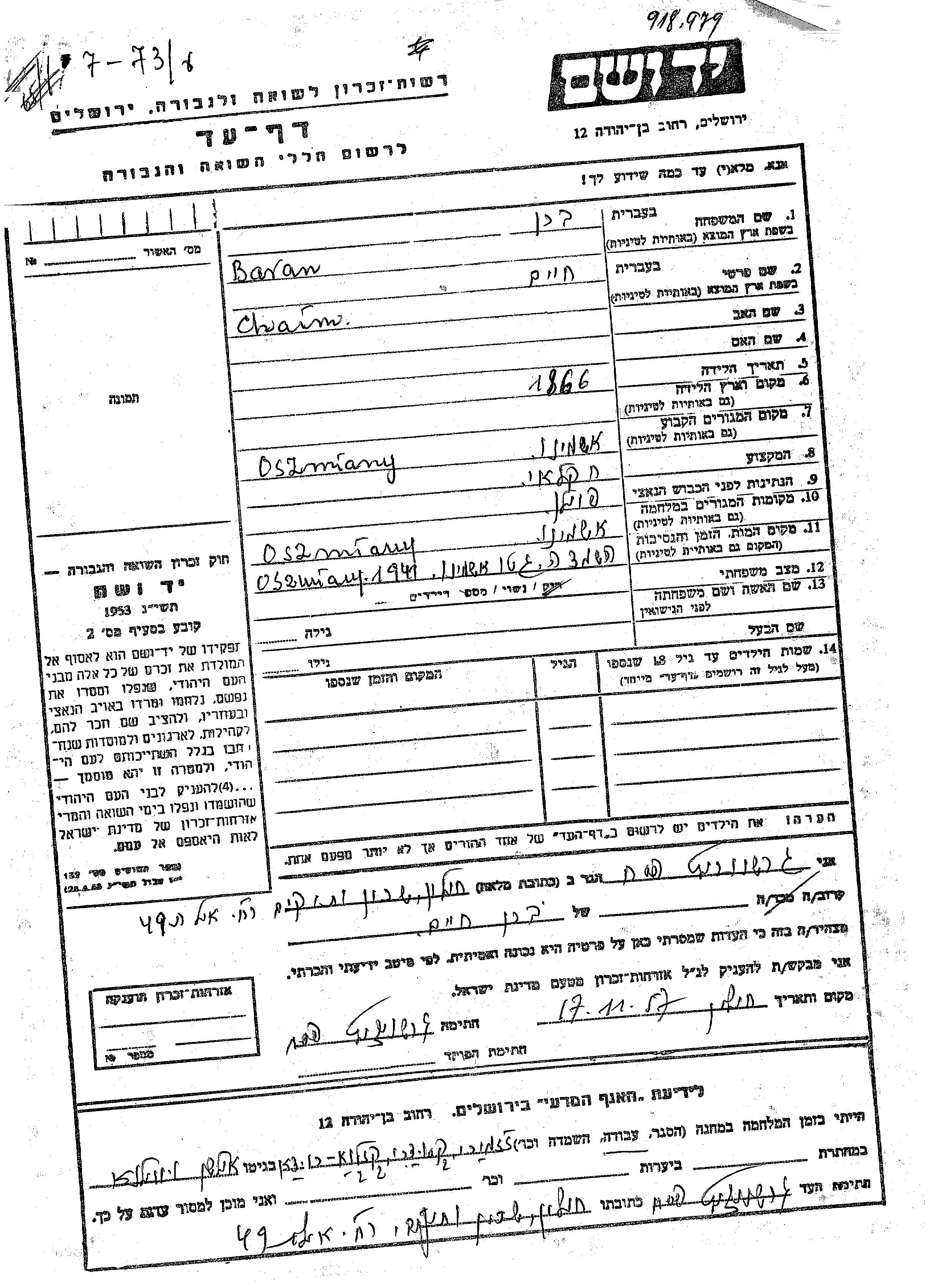Chaim Baran was born, 1866. He was an agriculturist and married. Prior to WWII he lived in Oszmiana, Poland. During the war he was in Oszmiana, Poland.