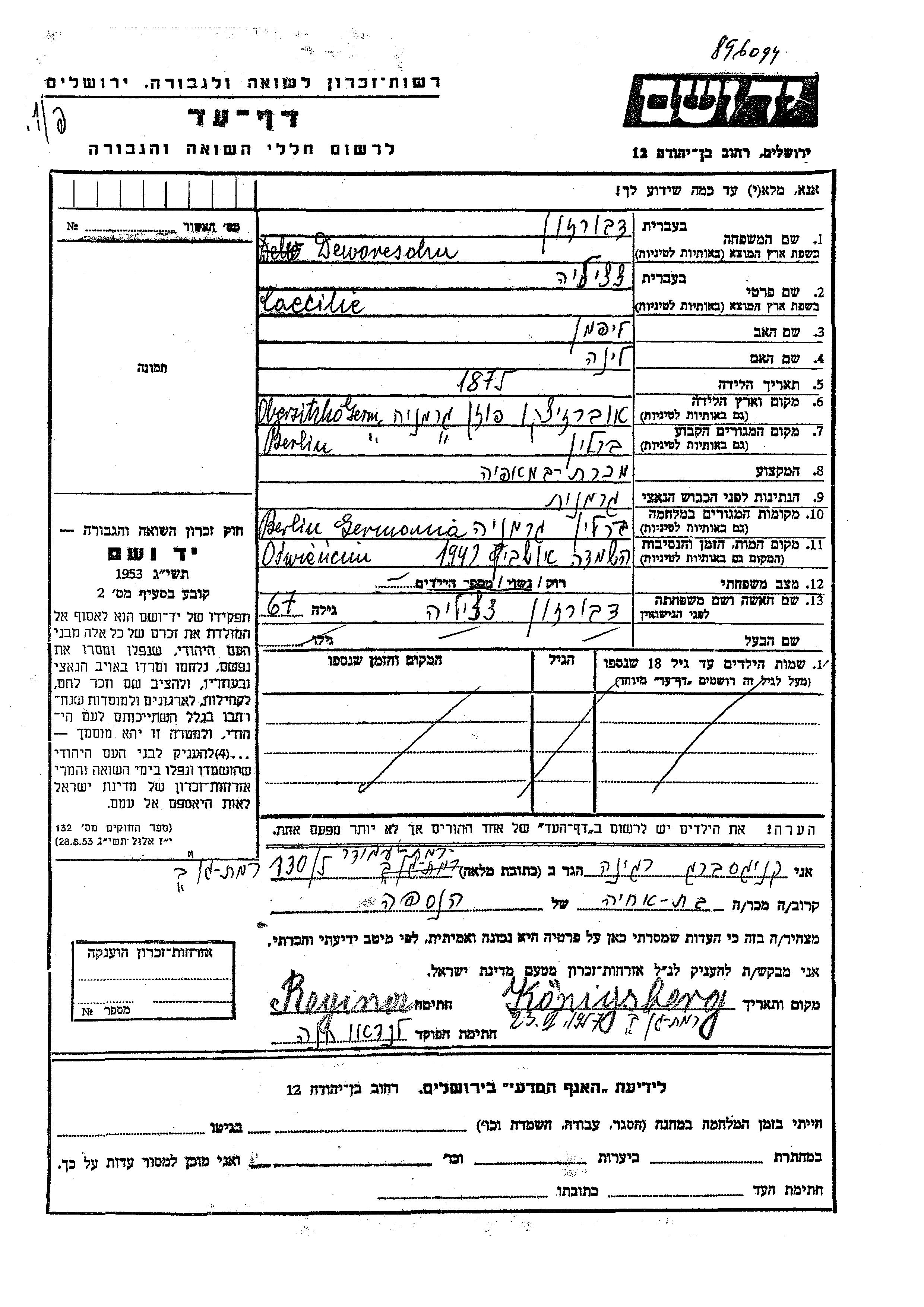 Caecilie Deworesohn was born in Obersitzko, Poland, 1875 to Lipman and Lina. She was a saleswoman and married. Prior to WWII she lived in Berlin, Germany. During the war she was in Berlin, Germany. Caecilie was murdered in the Shoah. Place of death: Auschwitz, Poland, 1942.