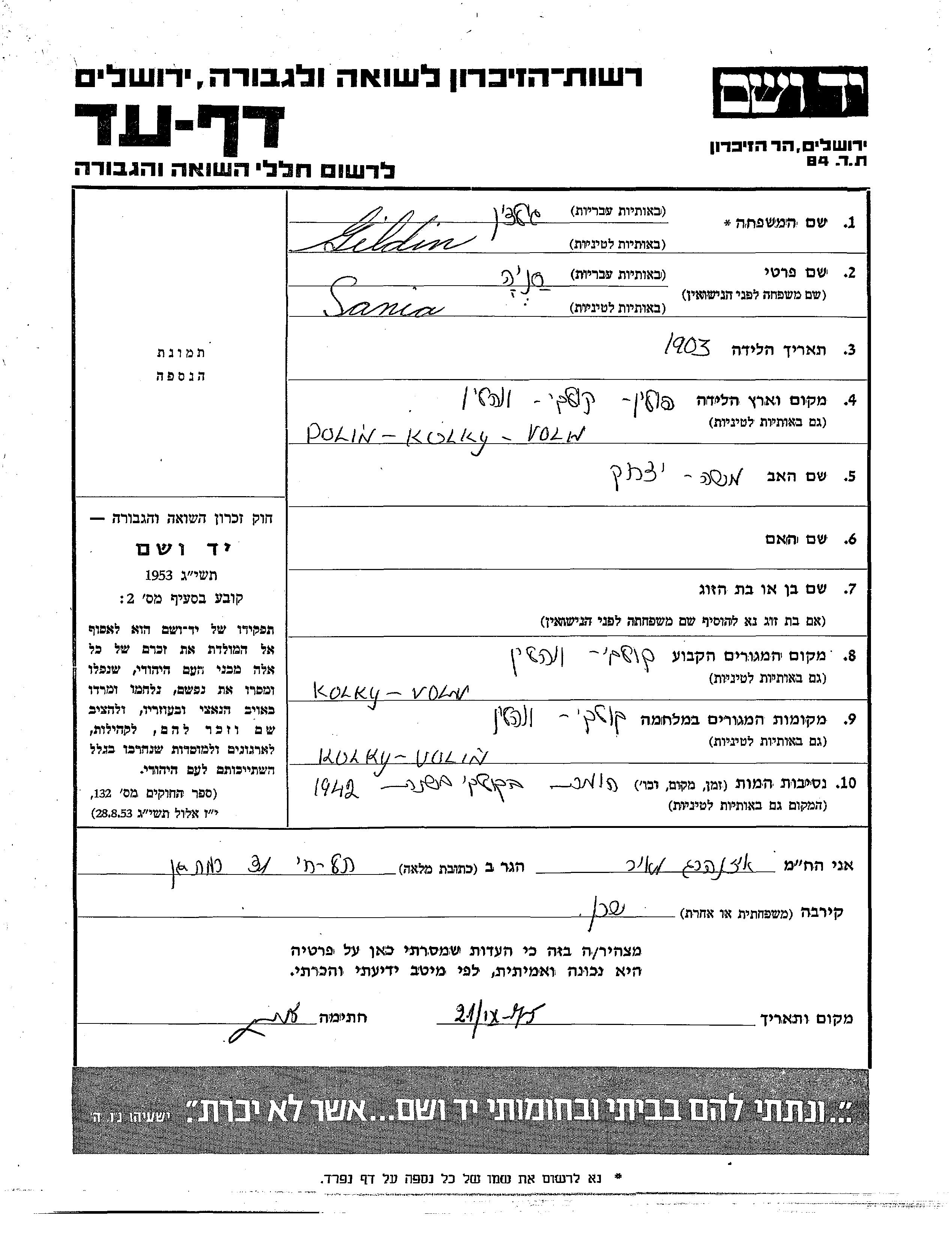 Sania Gildin was born in Kolka, Poland, 1903 to Moshe Yitzkhak. Prior to WWII he lived in Kolka, Poland. During the war he was in Kolka, Poland. Sania was murdered in the Shoah. Place of death: Kolka, Poland, 1942.