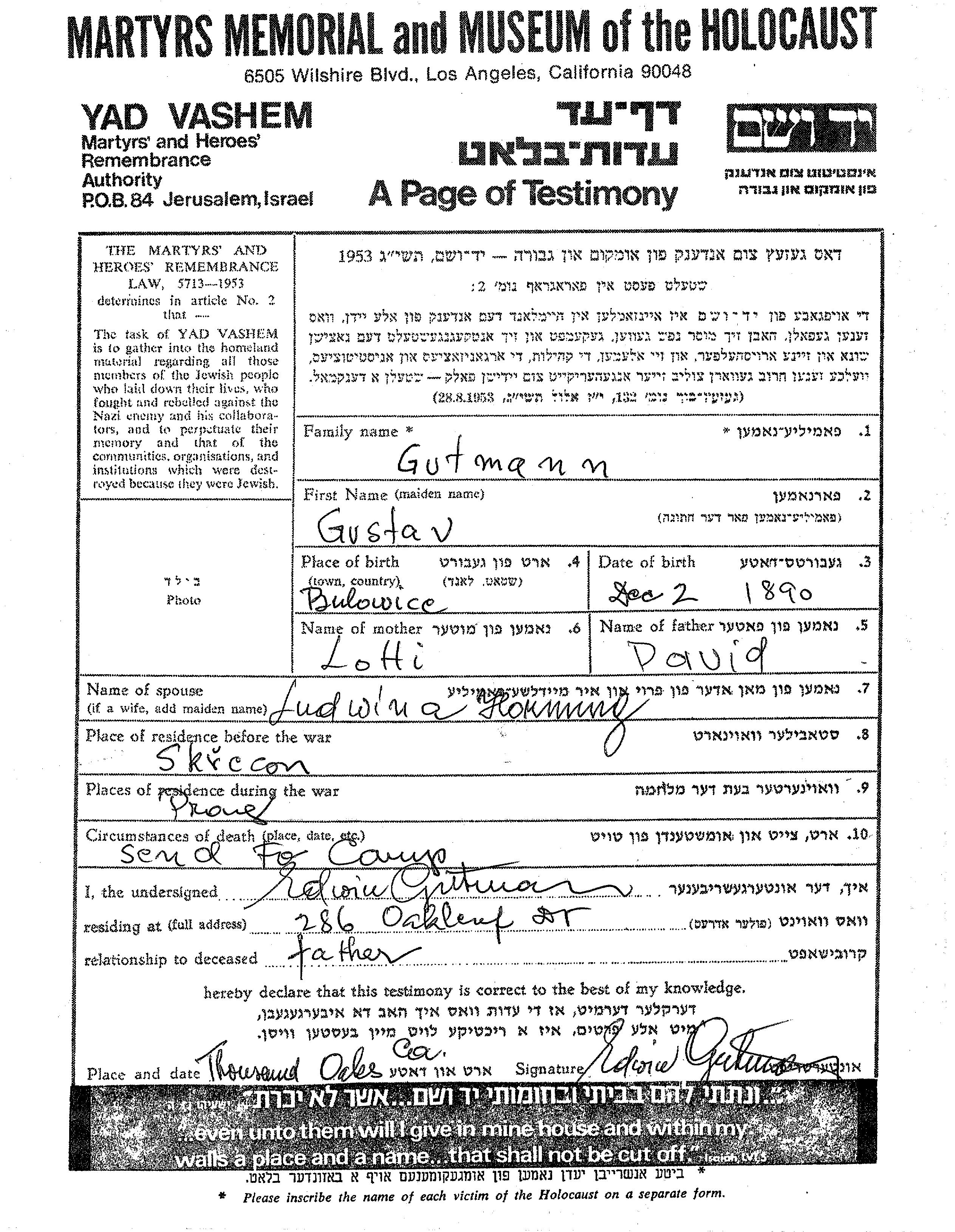 Gutmann Gustav 1890 Skrecon, Czechoslovakia Page of Testimony
