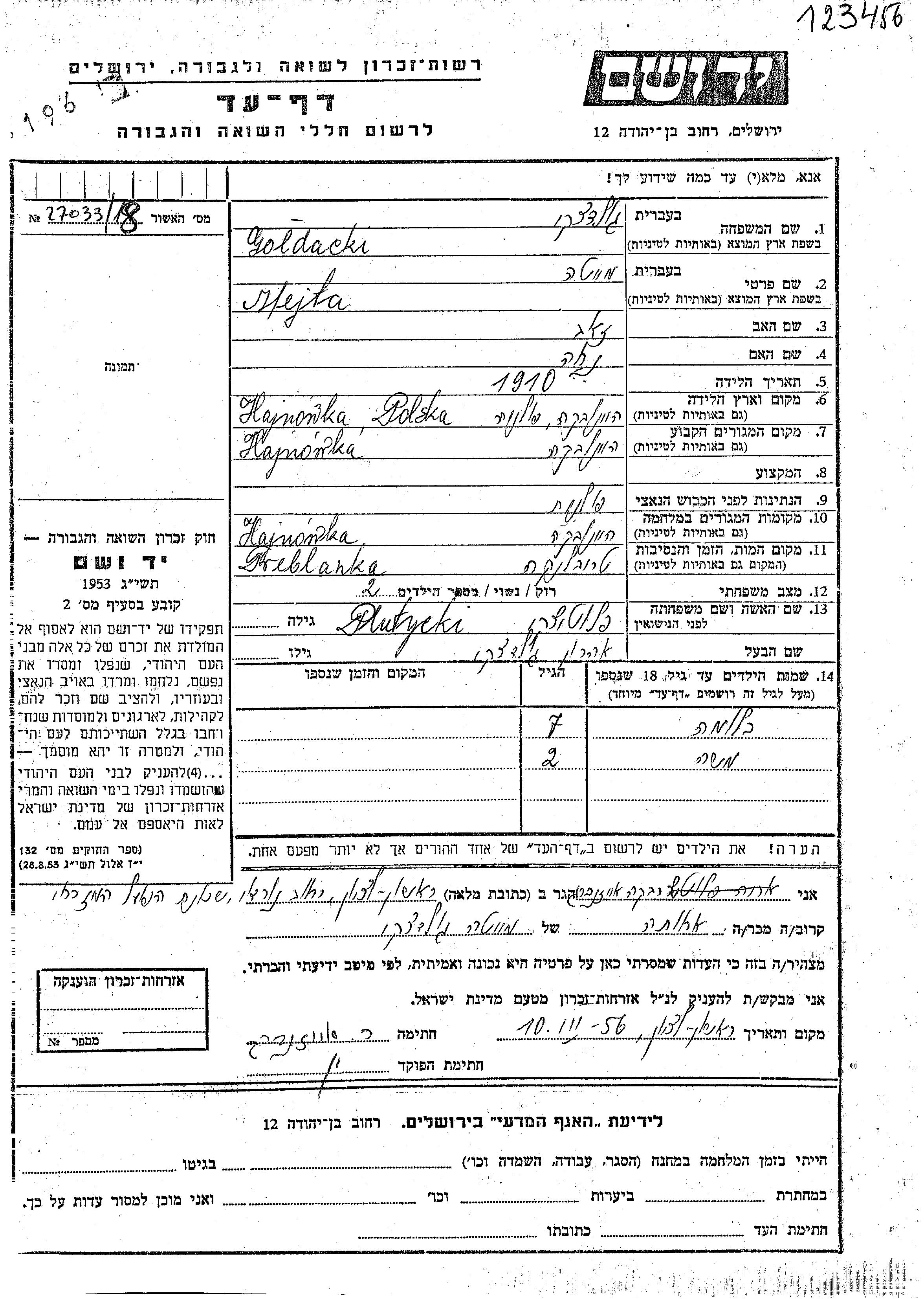 Mejta Goldacki nee Plutycki was born in Hajnówka, Poland, 1910 to Zeev and Nekha. She was married to Aharon. Prior to WWII she lived in Hajnówka, Poland. During the war she was in Hajnówka, Poland. Mejta was murdered in the Shoah. Place of death: Treblinka, Poland.