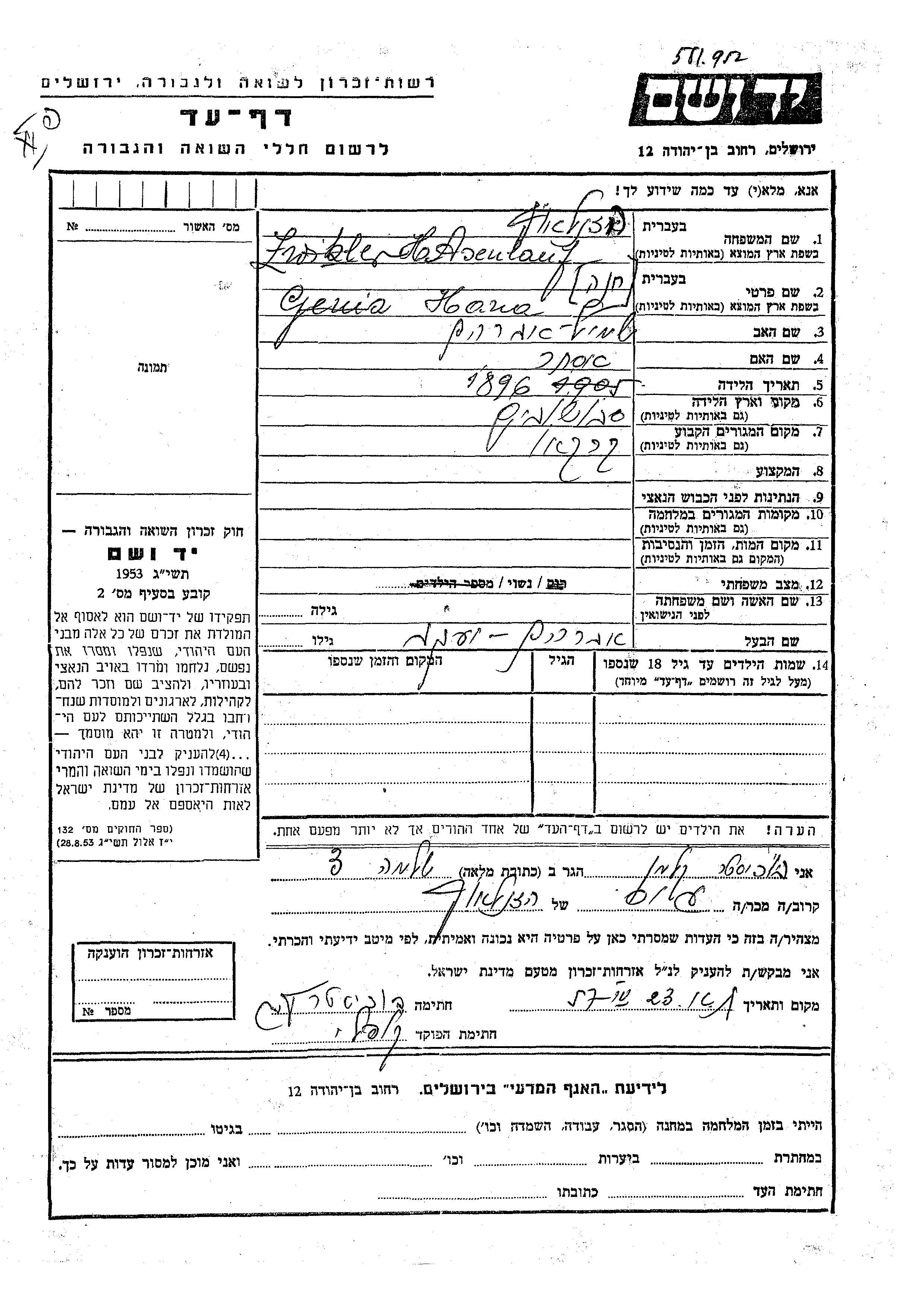 Hana Genia Hasenlauf Zwikler was born in Swoszowice, Poland, 1896 to Shmul Avraham and Ester. She was married to Avraham Yaakov. Prior to WWII she lived in Krakau, Poland. Hana Genia was murdered in the Shoah.