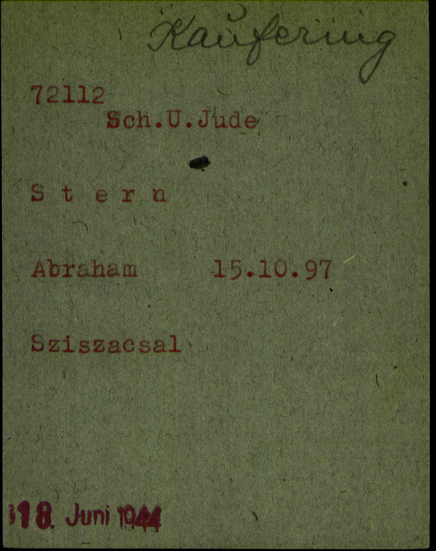 Abraham Stern was born, 1897. Prior to WWII he lived in Izaszacsal, Romania. During the war he was in Dachau, Germany.