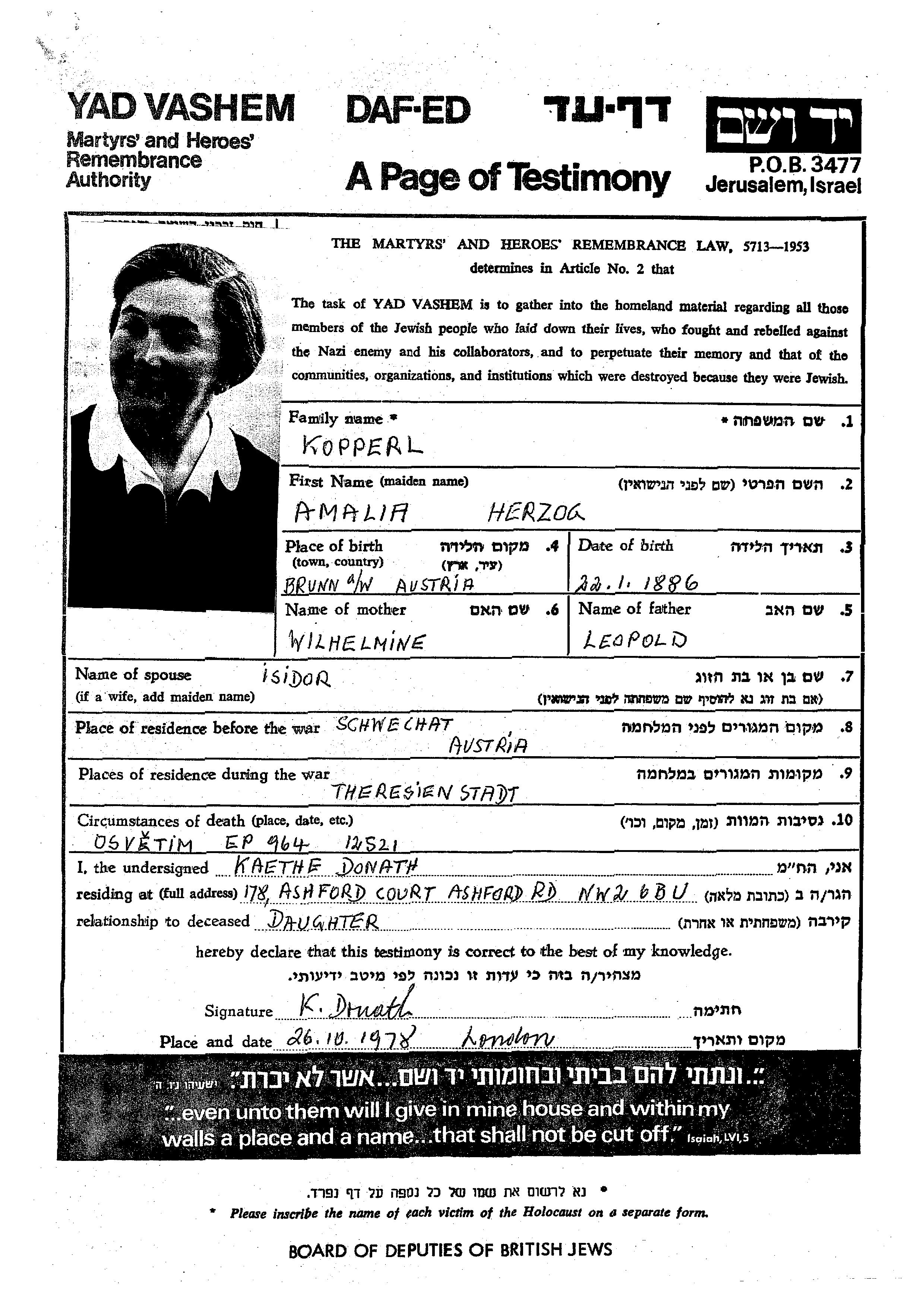 Kopperl Amalia 1886 Schwechat, Austria Page of Testimony