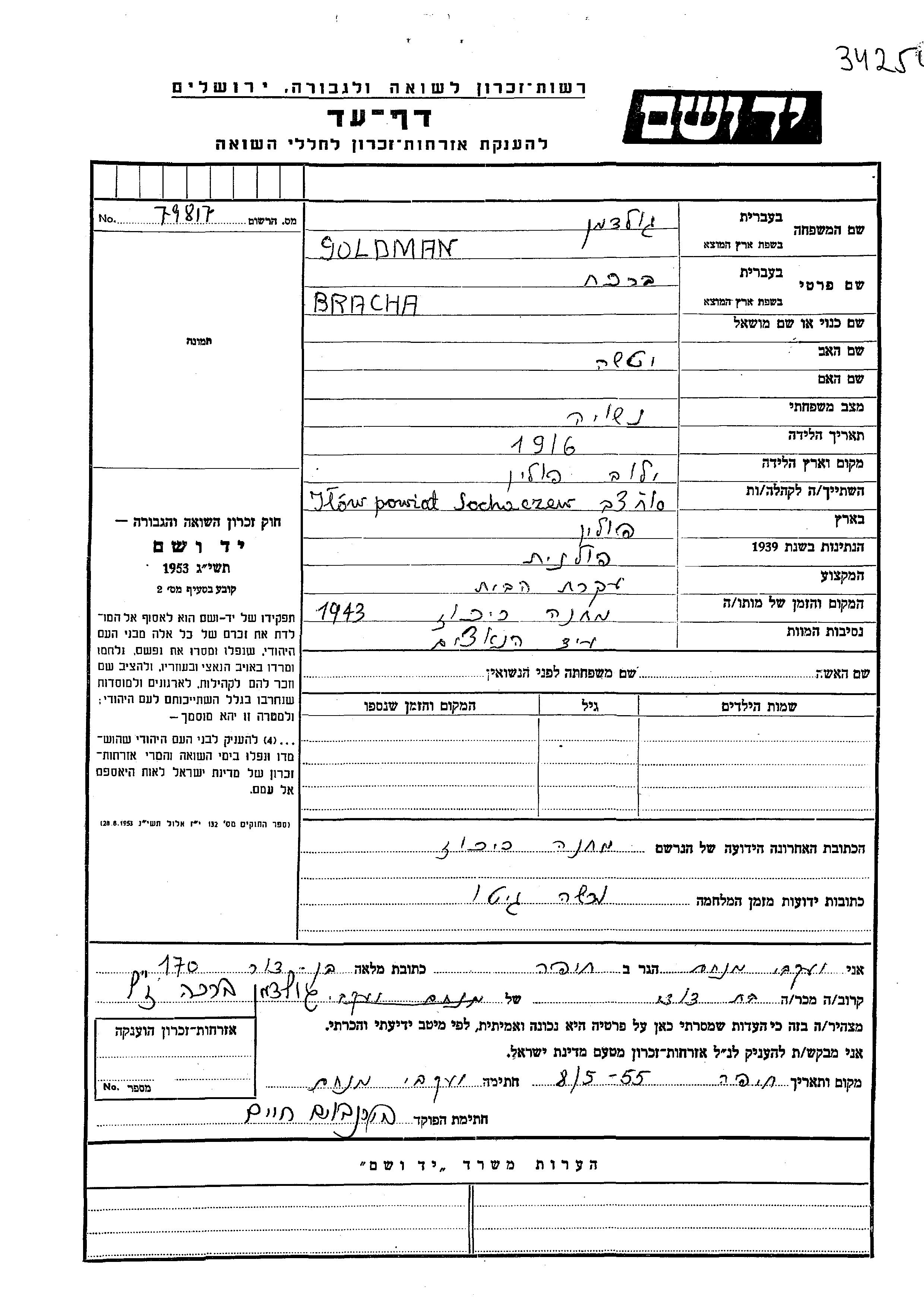 Goldman Bracha 1916 Iłów, Poland Page of Testimony