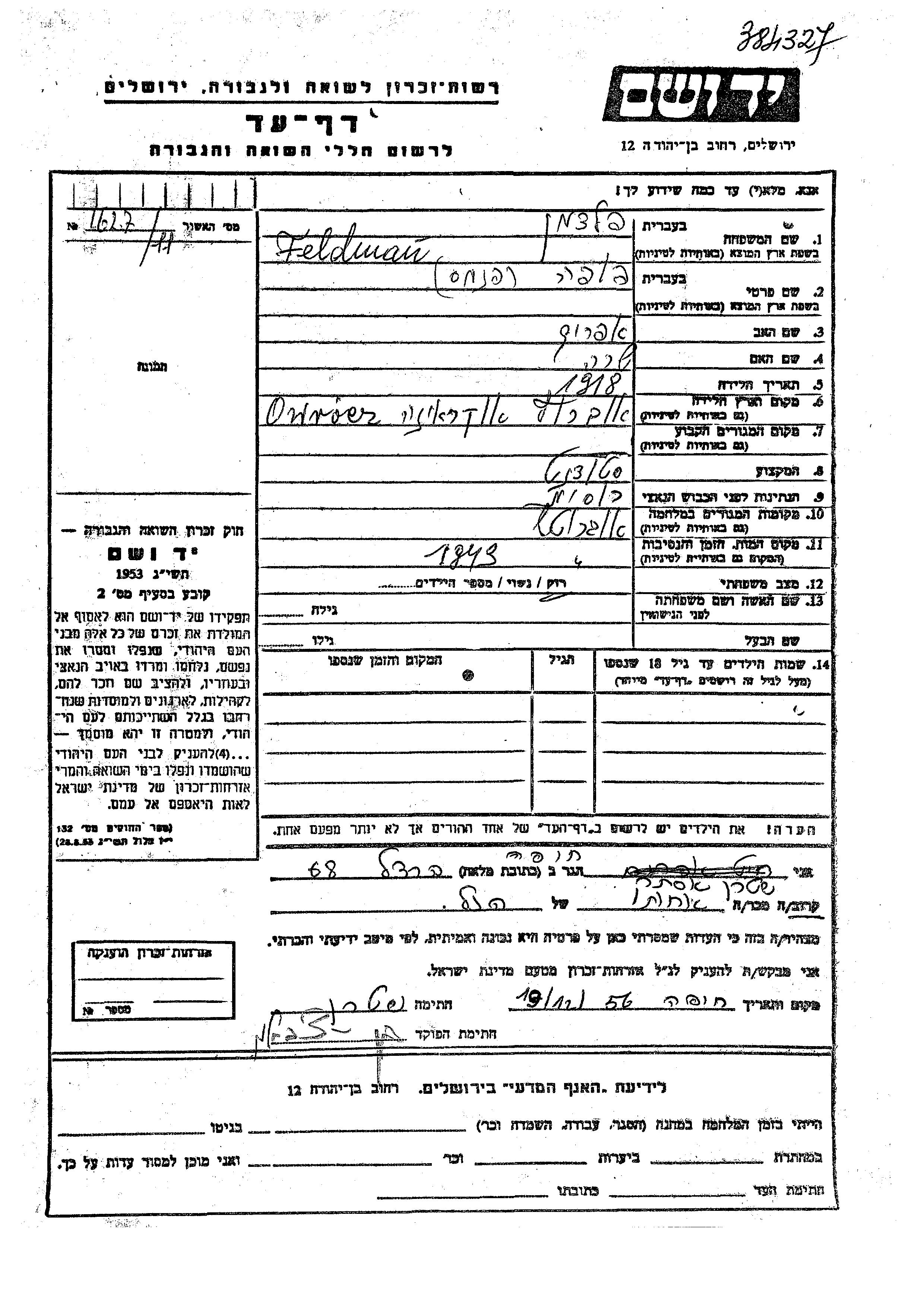 Popa Pinkhas Feldman was born in Owrucz, Ukraine (USSR), 1918 to Efraim and Sara. He was a student and single. Prior to WWII he lived in unstated place. During the war he was in Owrucz, Ukraine (USSR).