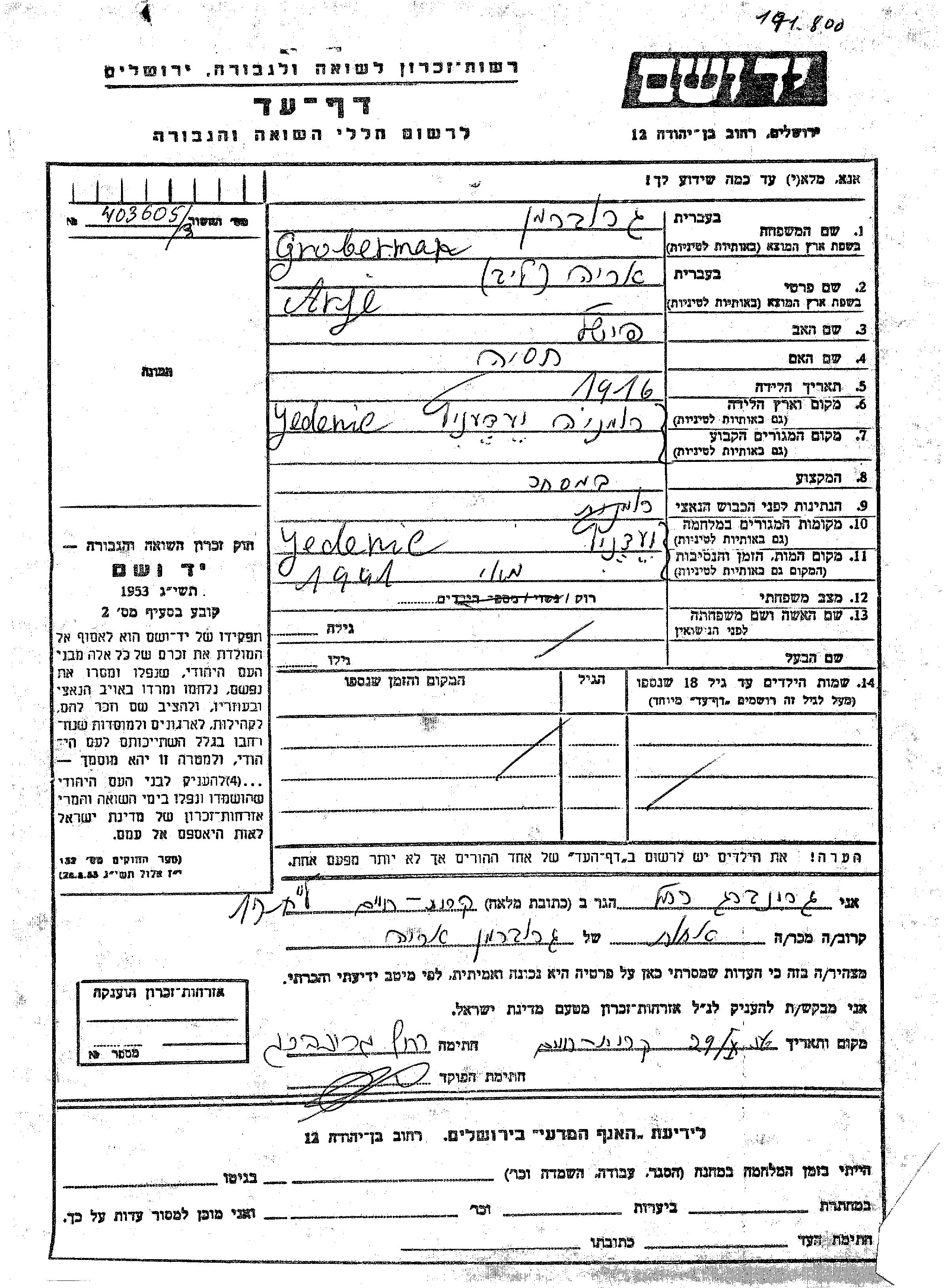 Arje Leib Groberman was born in Yedenitz, Romania, 1916 to Fishel and Khasia. He was a merchant and single. Prior to WWII he lived in Yedenitz, Romania. During the war he was in Yedenitz, Romania. Arje Leib was murdered in the Shoah. Place of death: Yedenitz, Romania, 1941.