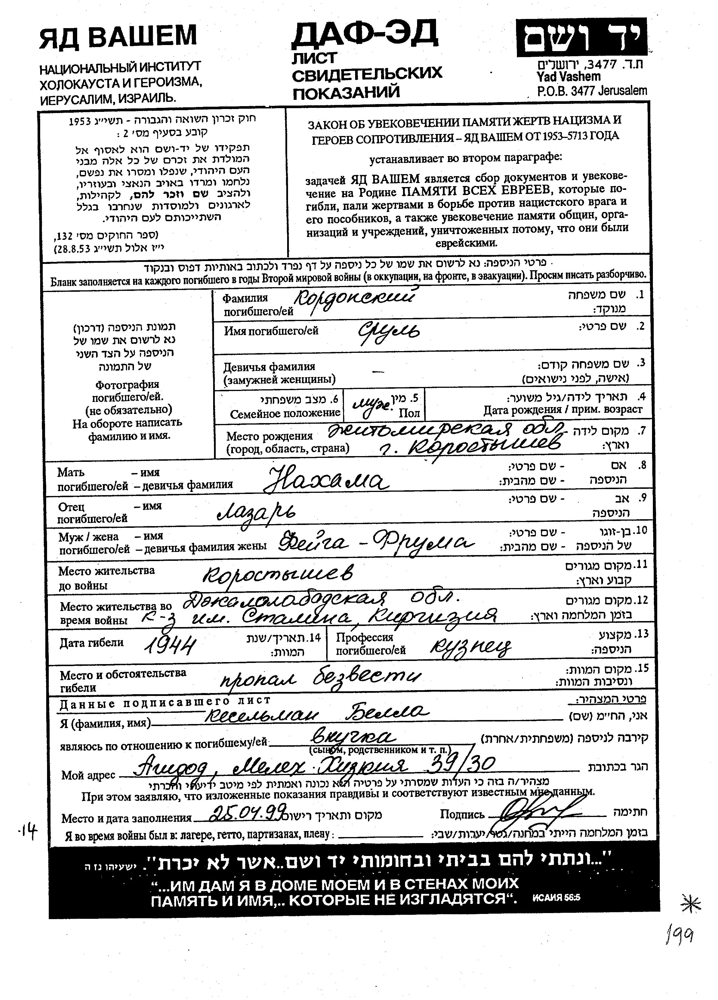 Kordonski Srul Kirghizstan (USSR) Page of Testimony