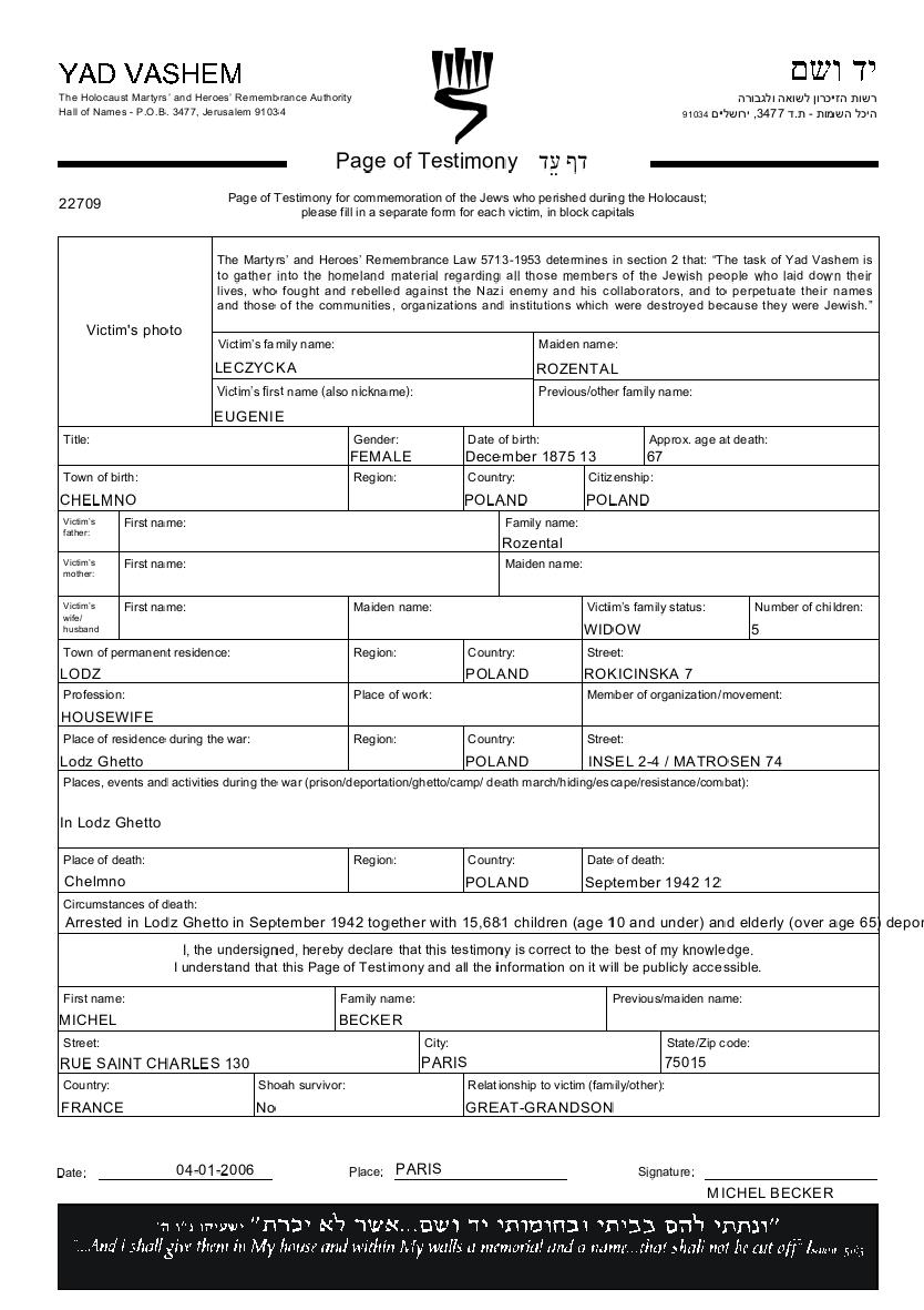 Eugenie Leczycka nee Rozental was born in Chelmno, Poland, 1875. She was a housewife and a widow. Prior to WWII she lived in Lodz, Poland. During the war she was in Lodz, Poland. Eugenie was murdered in the Shoah. Place of death: Chelmno, Poland, 12/09/1942.