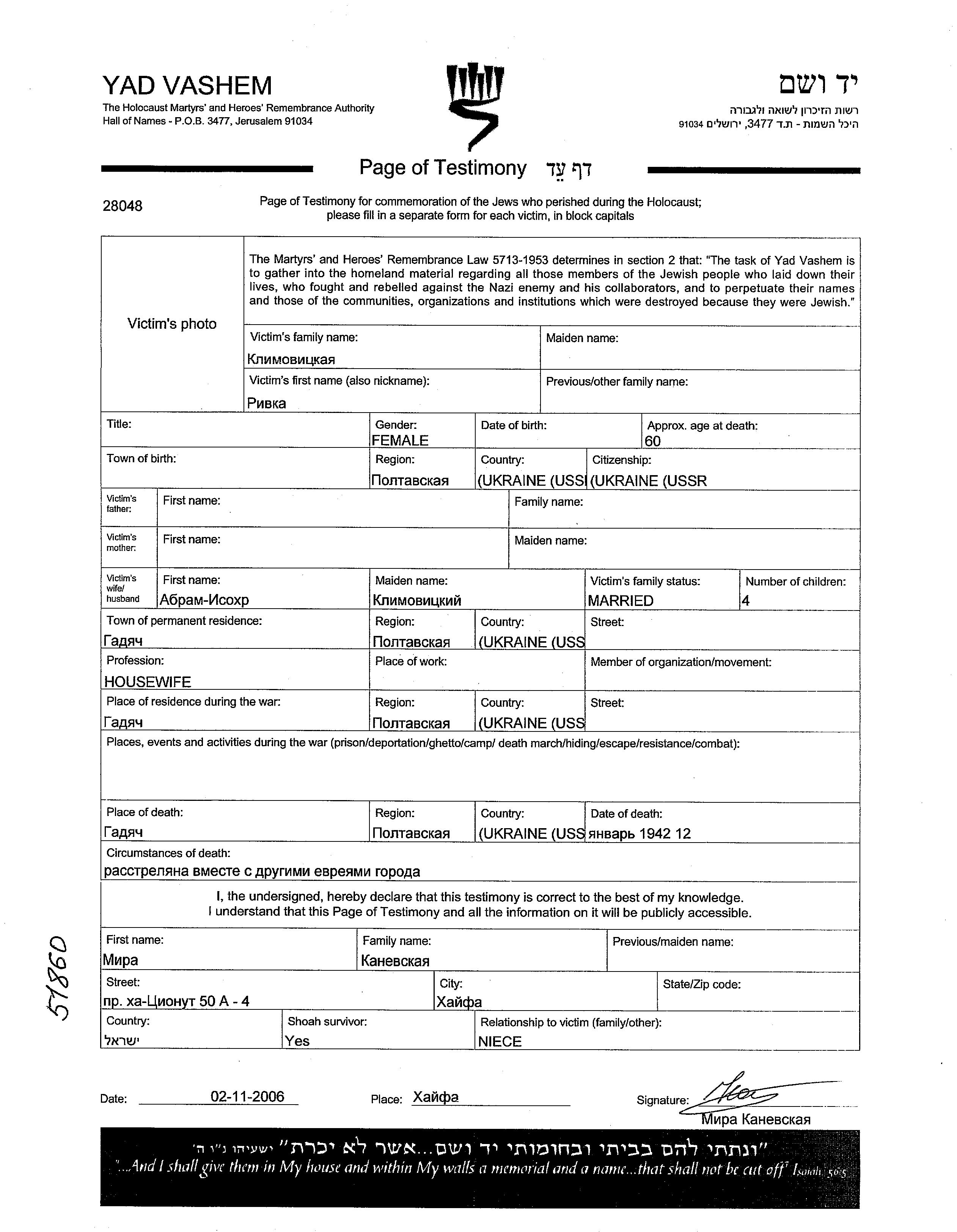 Rivka Klimovitzkaya was born in Poltava, Ukraine (USSR). She was a housewife and married to Abram Isokhr. Prior to WWII she lived in Gadiach, Ukraine (USSR). During the war she was in Gadyach, Ukraine (USSR). Rivka was murdered in the Shoah. Place of death: Gadyach, Ukraine (USSR), 12/01/1942.