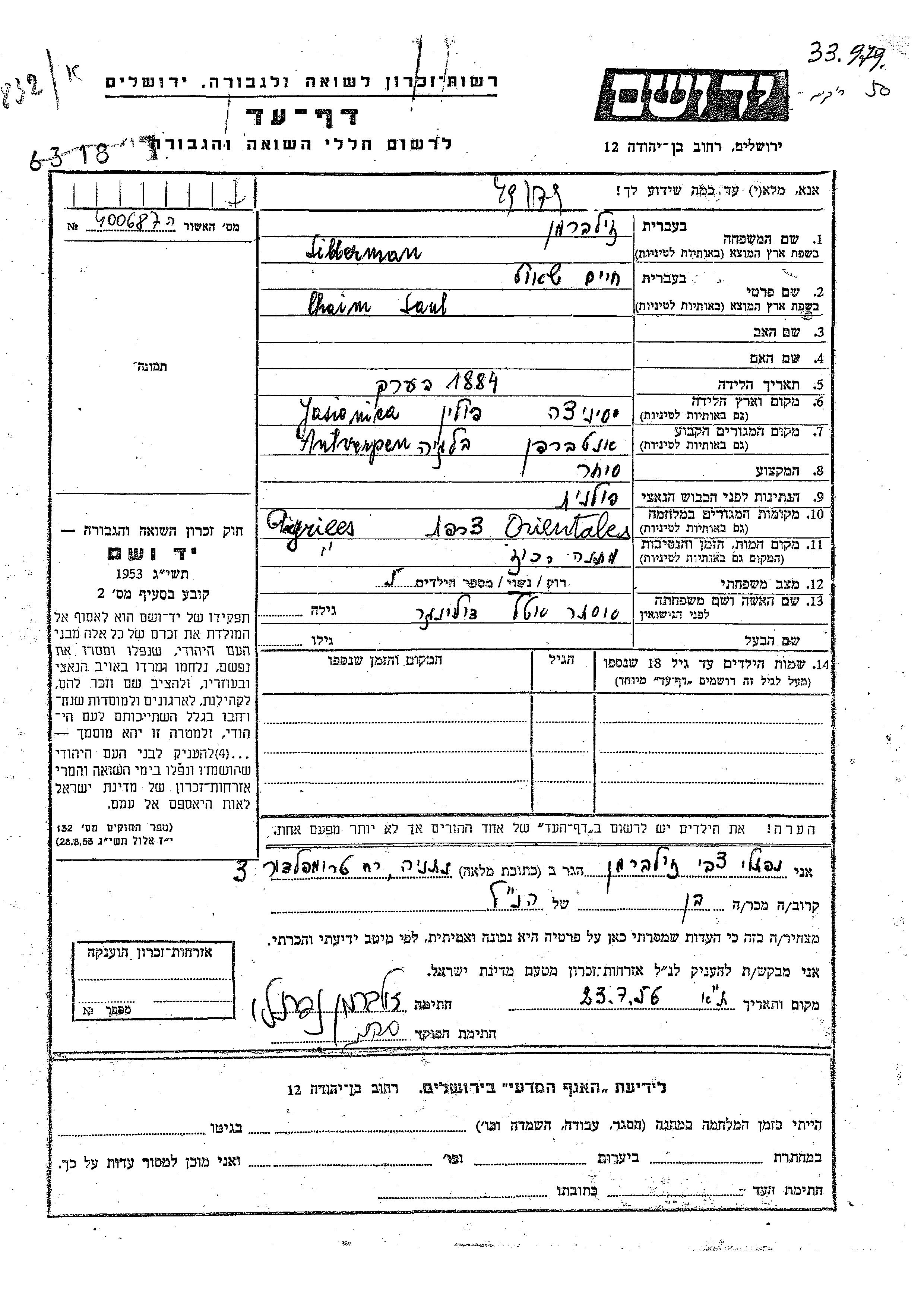 Silberman Chaim Shaul 1884 Antwerpen, Belgium Page of Testimony