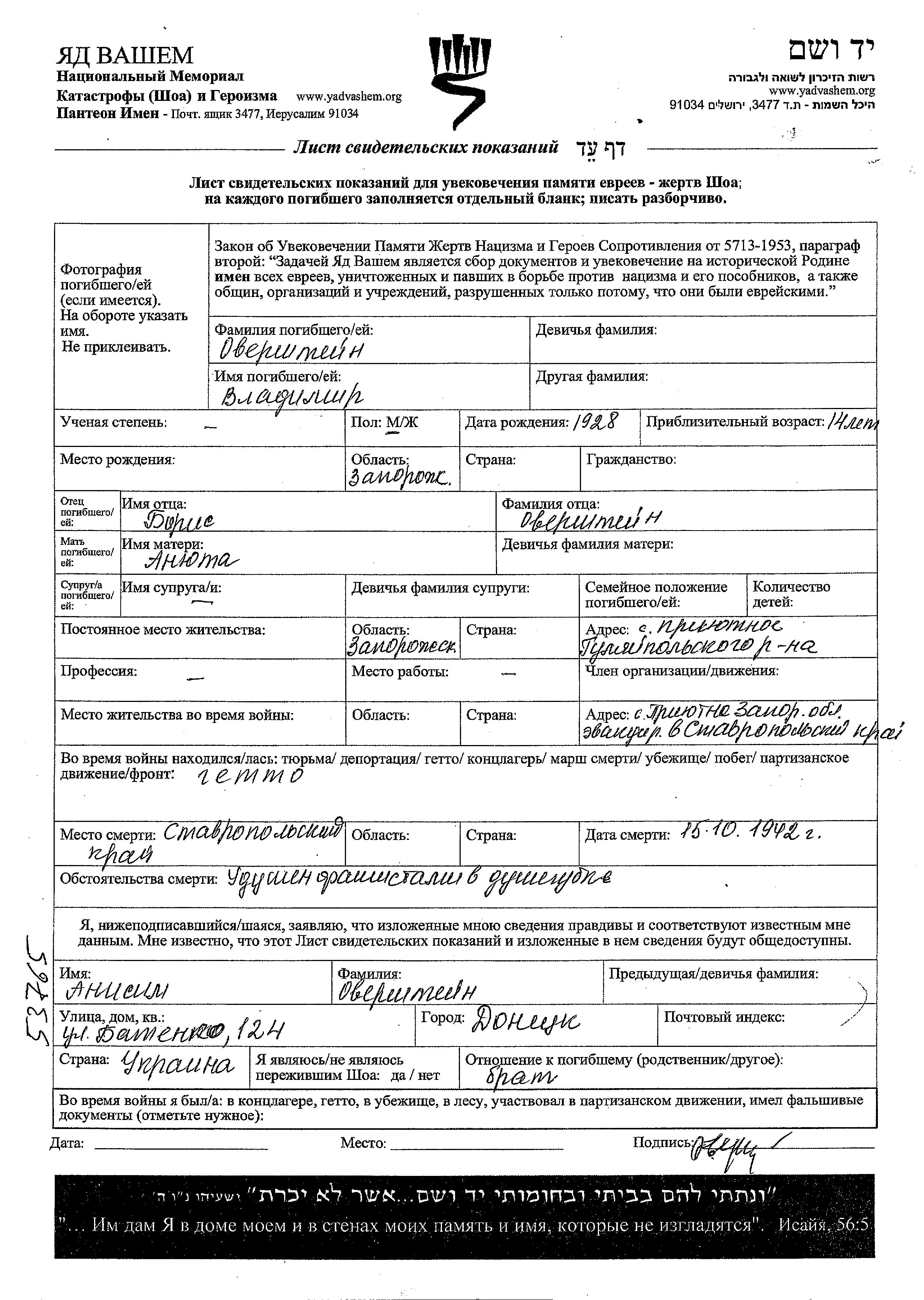 Overshtein Vladimir 1928 Pryyutne, Ukraine (USSR) Page of Testimony
