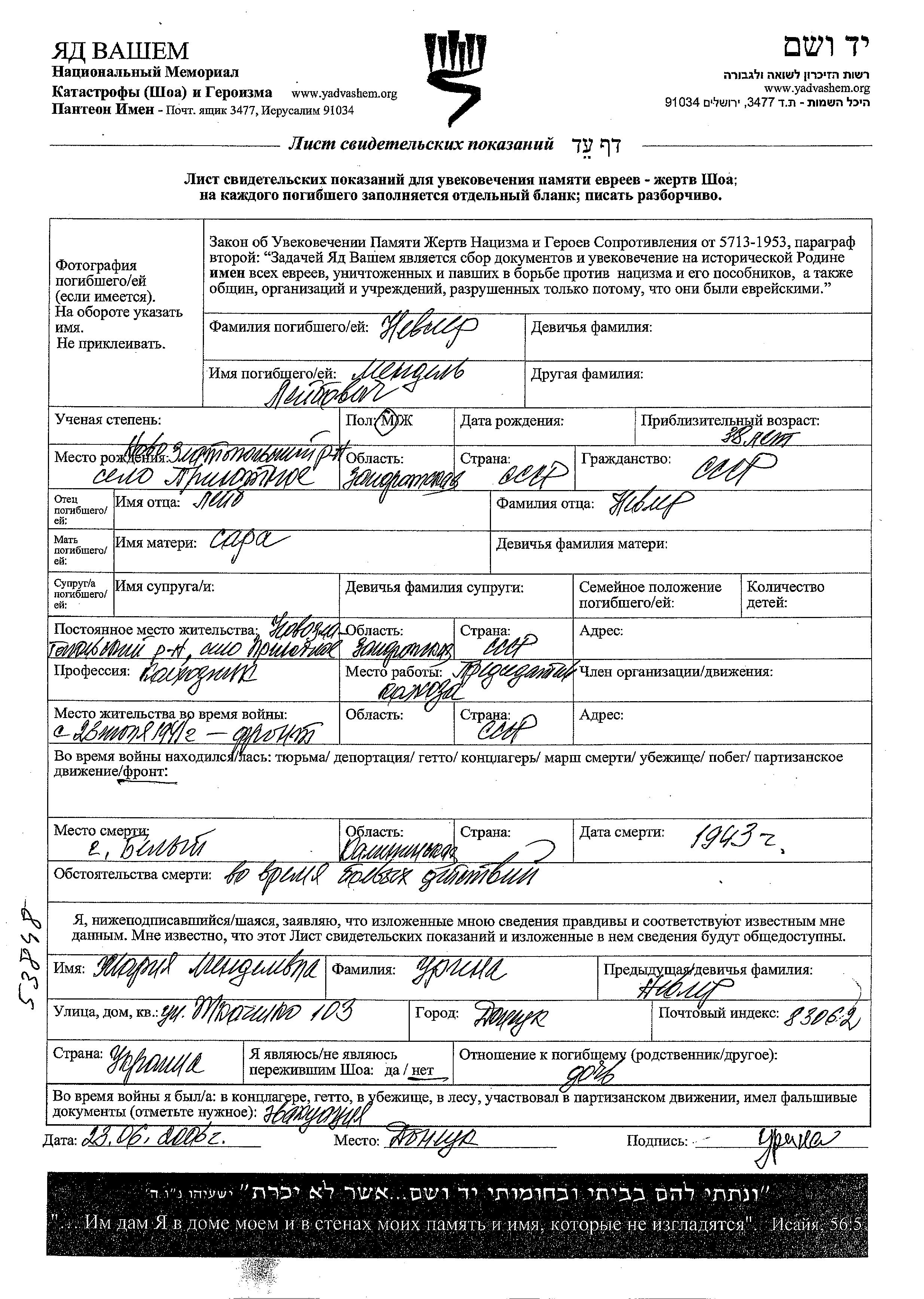 Mendel Nevler was born in Priyutnoye, Ukraine (USSR) to Leib and Sara. He was a kolkhoznik / kolkhoznitza. Prior to WWII he lived in Priyutnoye, Ukraine (USSR). During the war he was in the Soviet armed forces. Mendel was killed in military service in WWII. Place of death: Belyi, Russia (USSR), 1943.