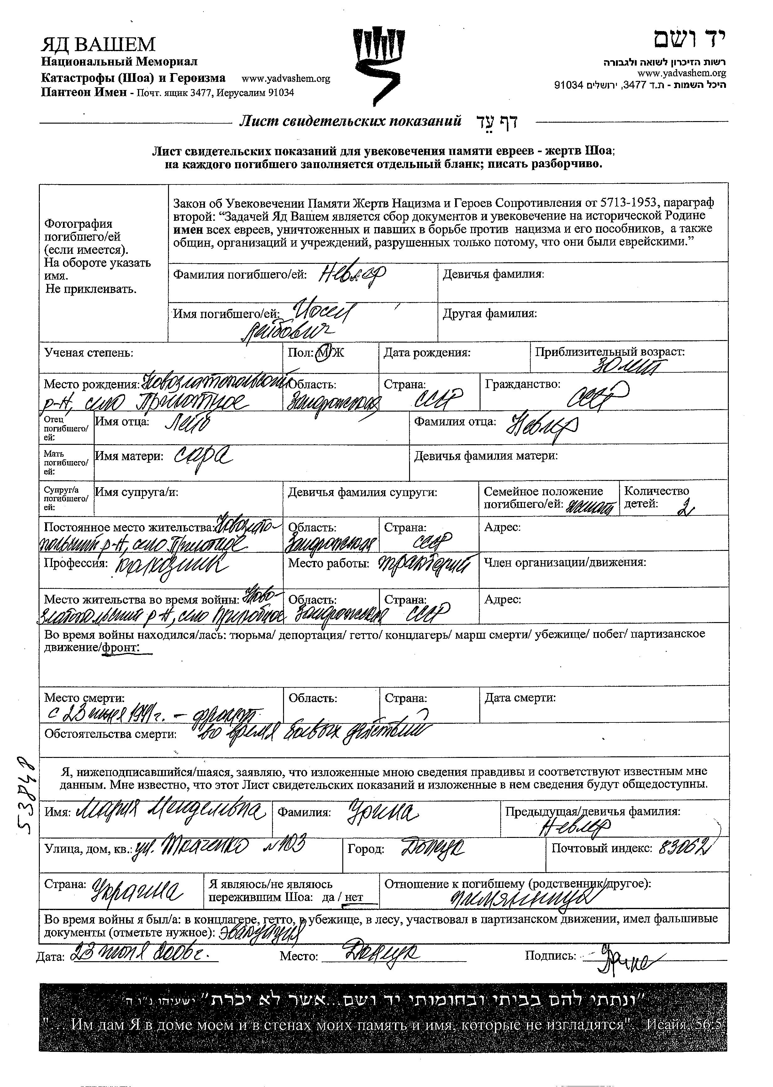 Ioselei Nevler was born in Priyutnoye, Ukraine (USSR) to Leib and Sara. He was a kolkhoznik / kolkhoznitza and married. Prior to WWII he lived in Priyutnoye, Ukraine (USSR). During the war he was in the Soviet armed forces. Ioselei was killed in military service in WWII.