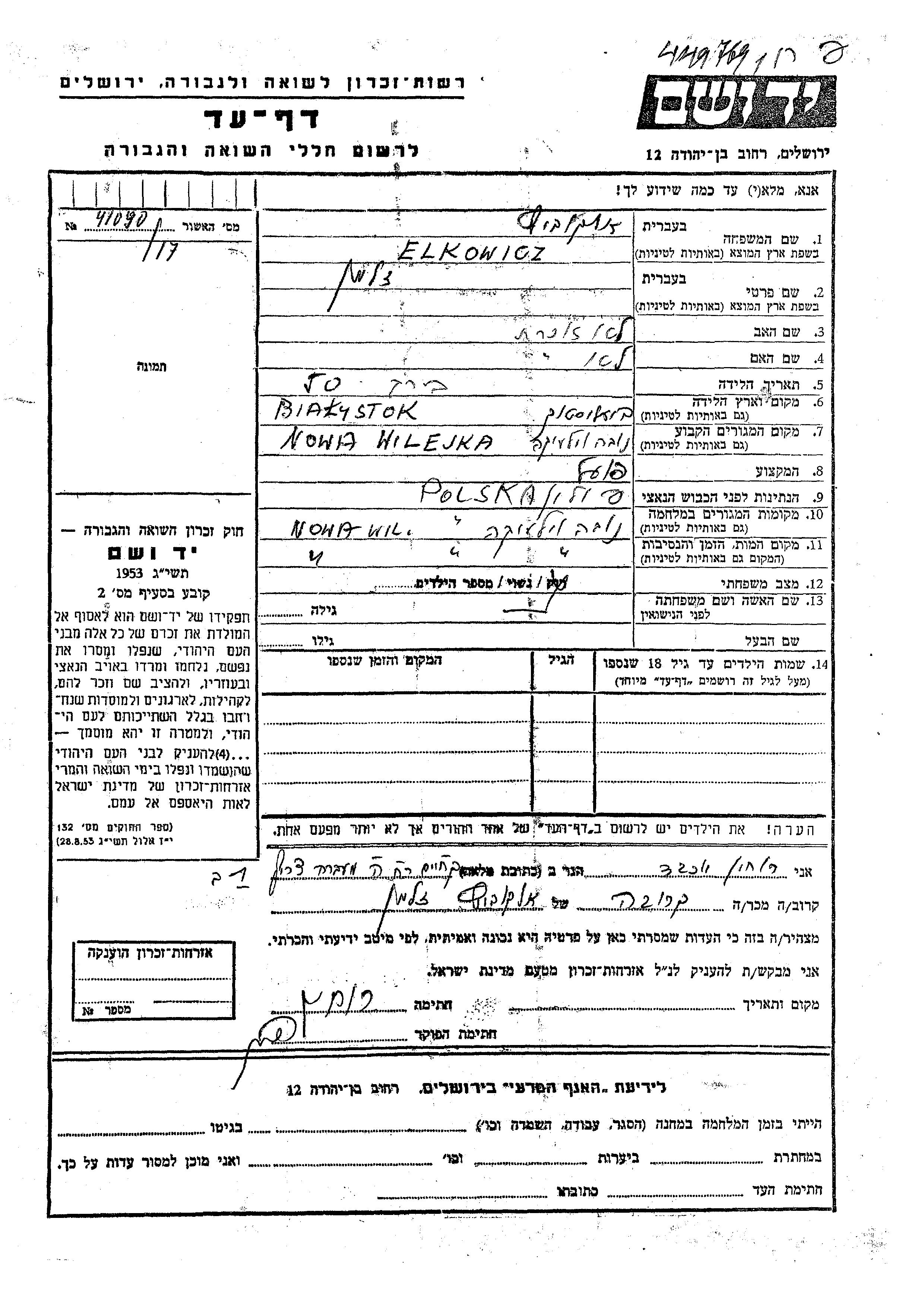 Zalman Elkowicz was born in Bialistok, Poland. He was a worker and married. Prior to WWII he lived in Nowa Wilejka, Poland. During the war he was in Nowa Wilejka, Poland. Zalman was murdered in the Shoah. Place of death: Nowa Wilejka, Poland.