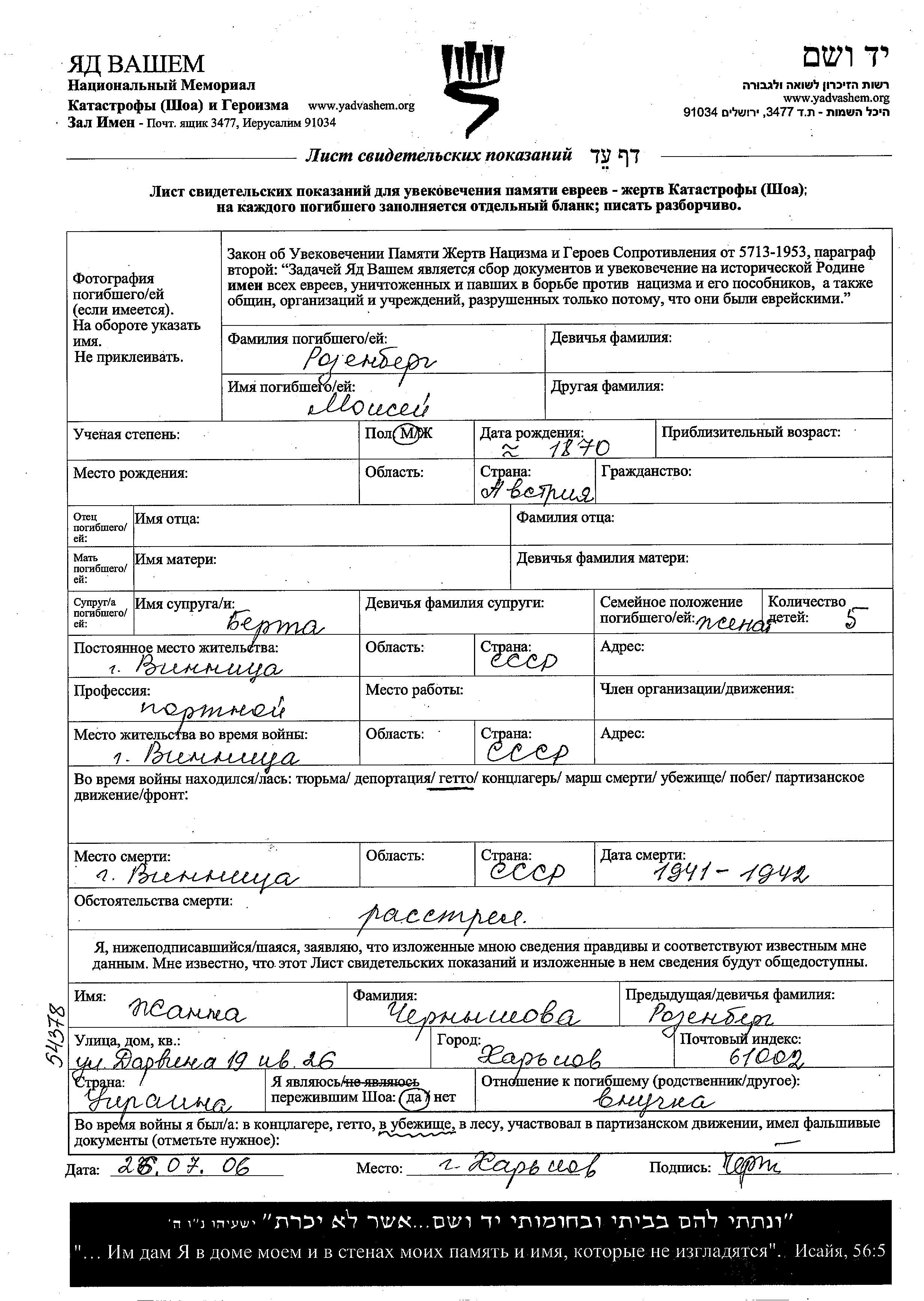 Rozenberg Moisei 1870 Vinnitsa, Ukraine (USSR) Page of Testimony