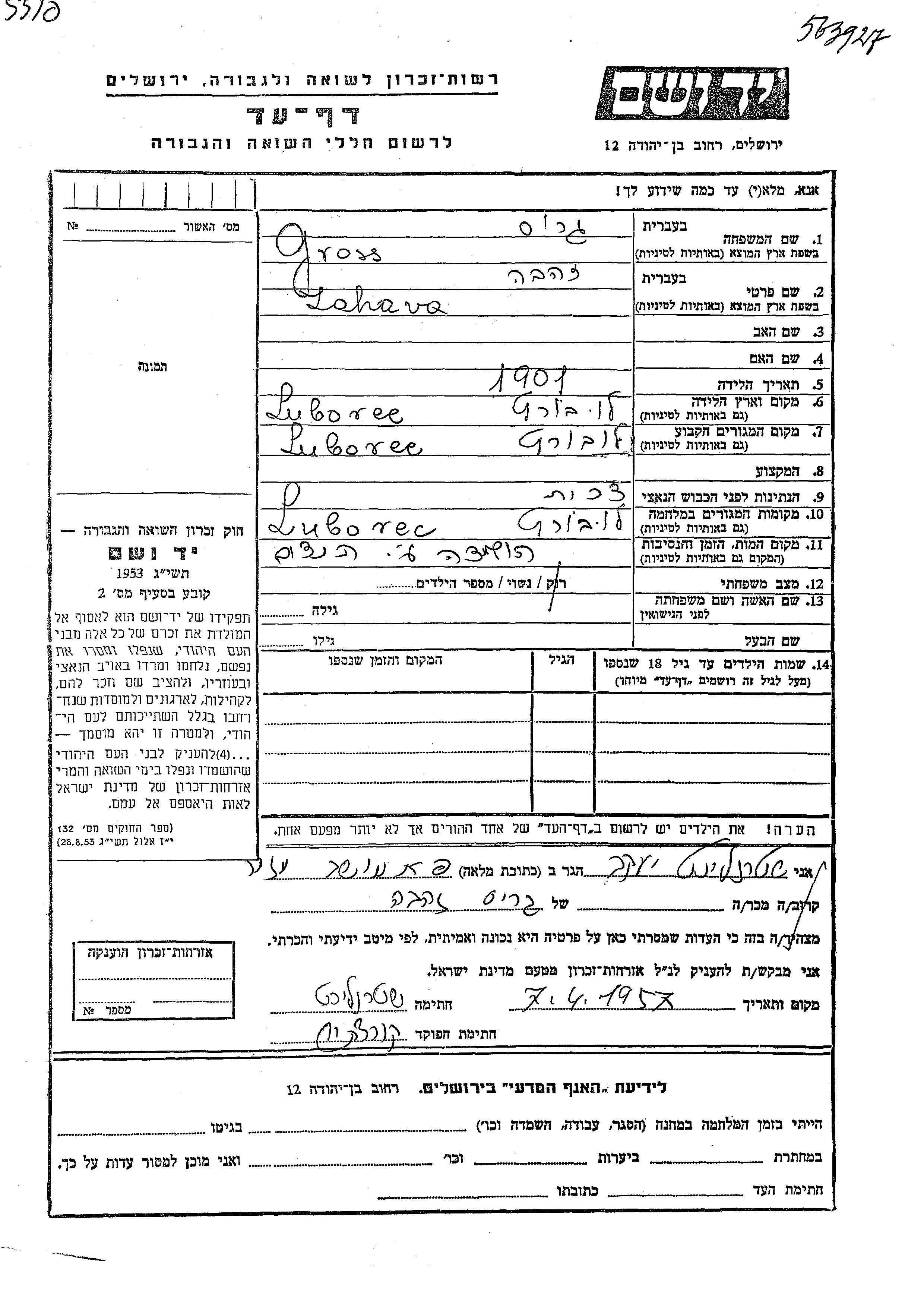 Zahava Gross was born in Luborca, Czechoslovakia, 1901. She was single. Prior to WWII she lived in Luborca, Czechoslovakia. During the war she was in Luborca, Czechoslovakia. Zahava was murdered in the Shoah.