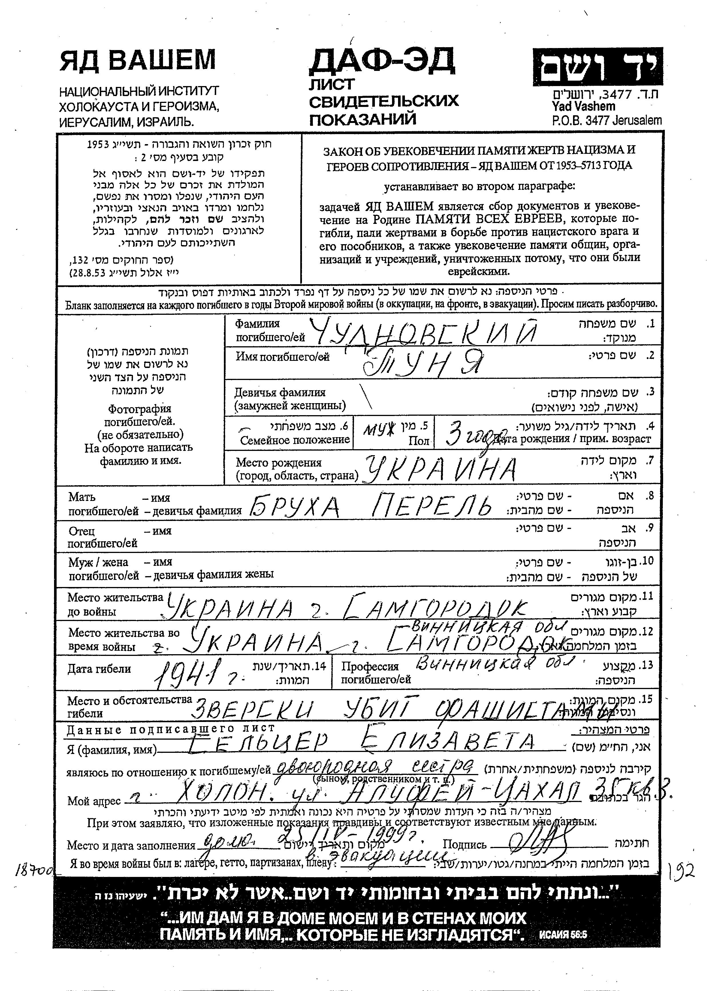 Chudnovski Tunya Samgorodok, Ukraine (USSR) Page of Testimony