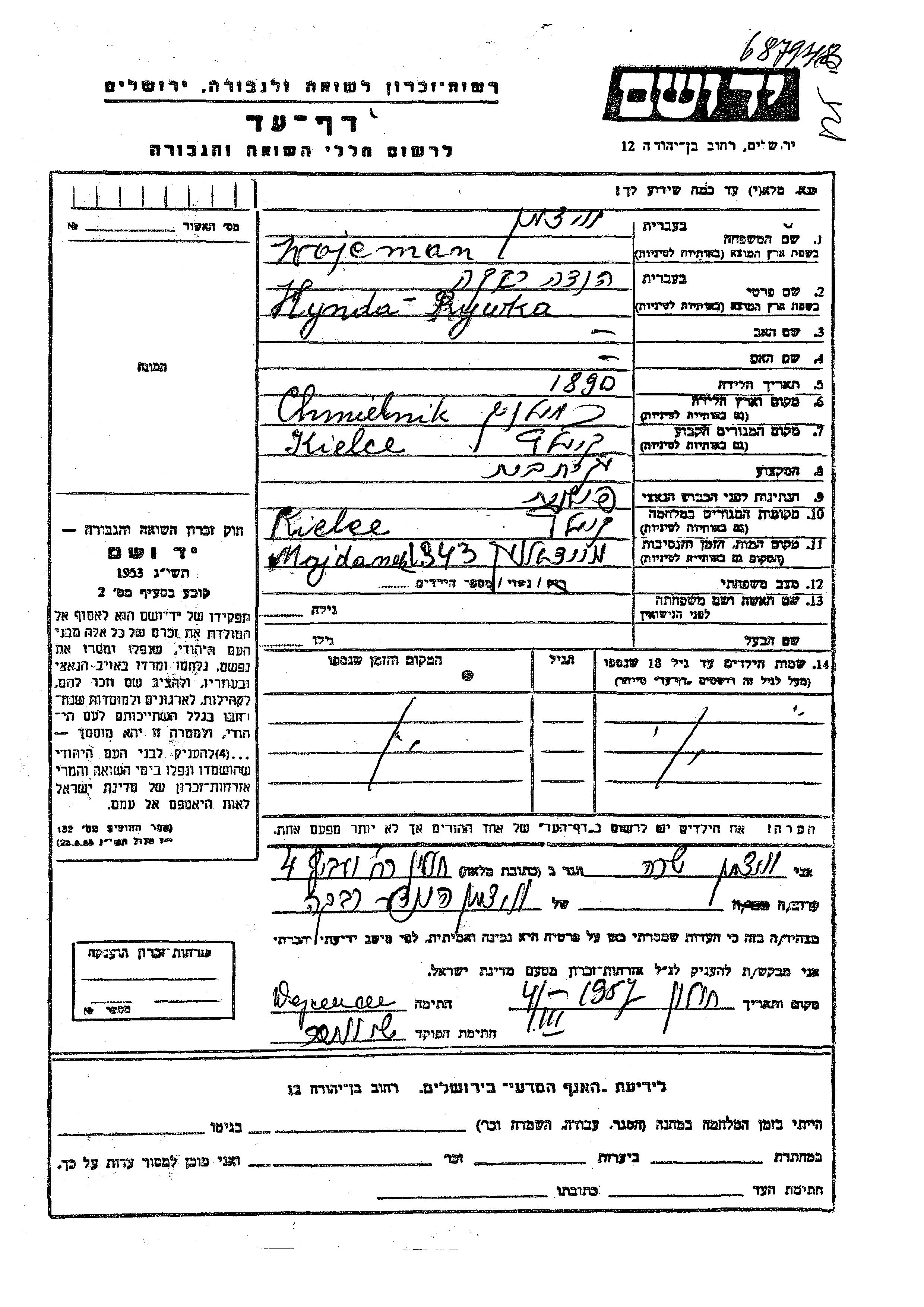 Hynda Rywka Wajcman was born in Chmielnik, Poland, 1890. She was a housewife and married. Prior to WWII she lived in Kielce, Poland. During the war she was in Kielce, Poland. Hynda Rywka was murdered in the Shoah. Place of death: Majdanek, Poland, 1943.