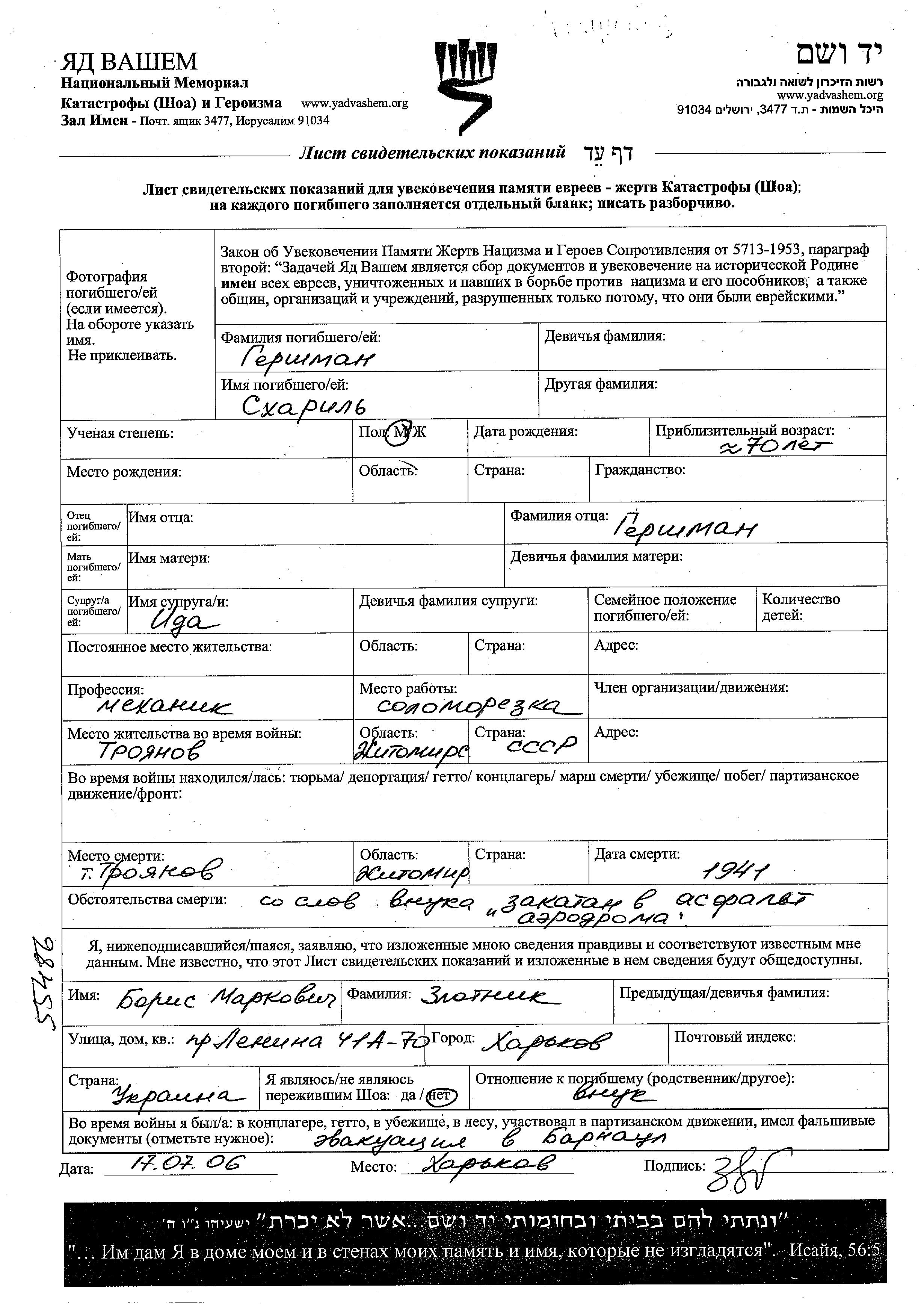 Skharil Gershman. He was a mechanic and married to Ida. Prior to WWII he lived in Troyanov, Ukraine (USSR). During the war he was in Troyanov, Ukraine (USSR). Skharil was murdered in the Shoah. Place of death: Troyanov, Ukraine (USSR), 1941.