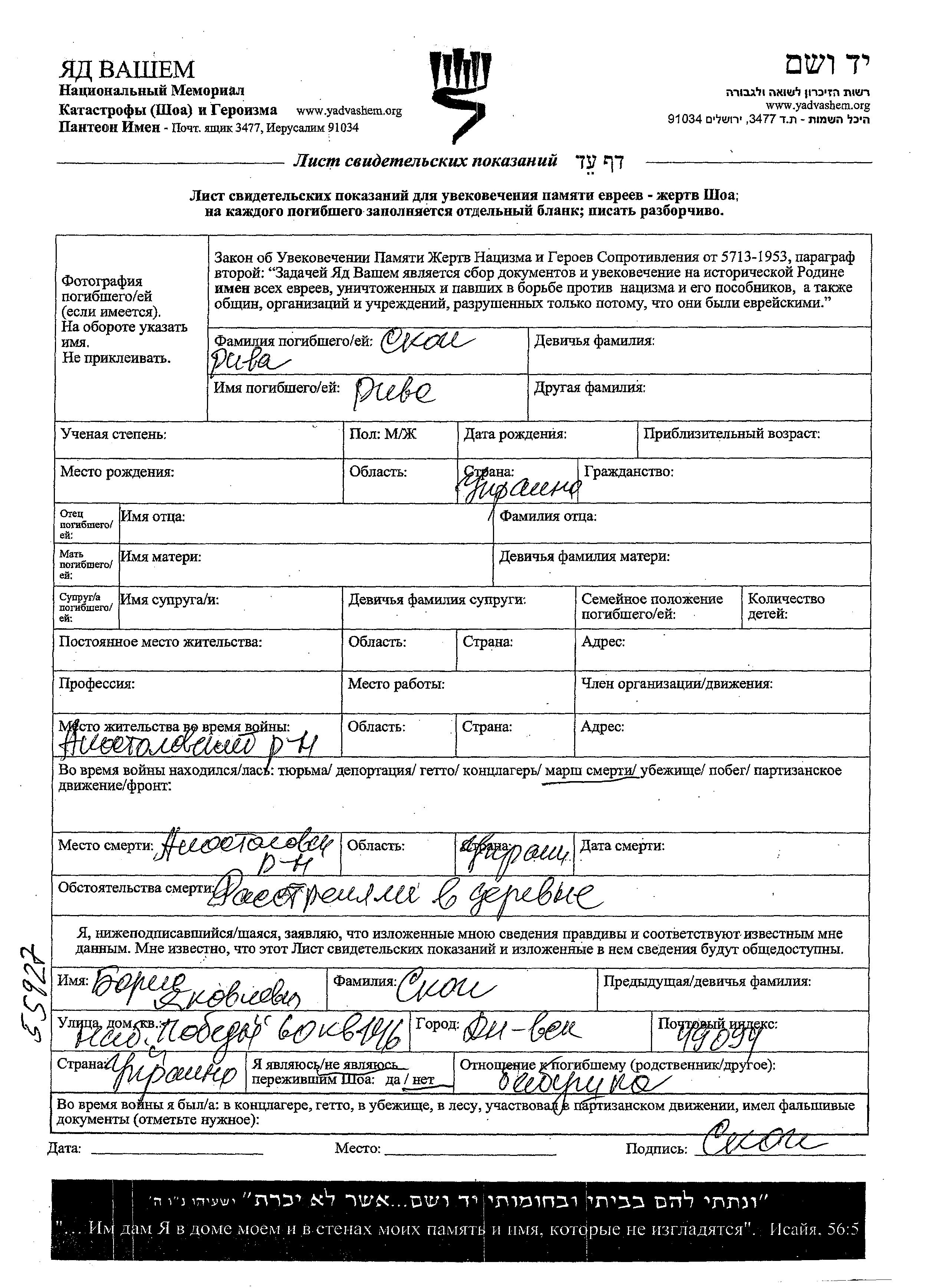Riva Skop was born in Ukraine (USSR). She was married. Prior to WWII she lived in Apostolovo, Ukraine (USSR). During the war she was in Apostolovo, Ukraine (USSR). Riva was murdered in the Shoah. Place of death: Apostolovo, Ukraine (USSR).