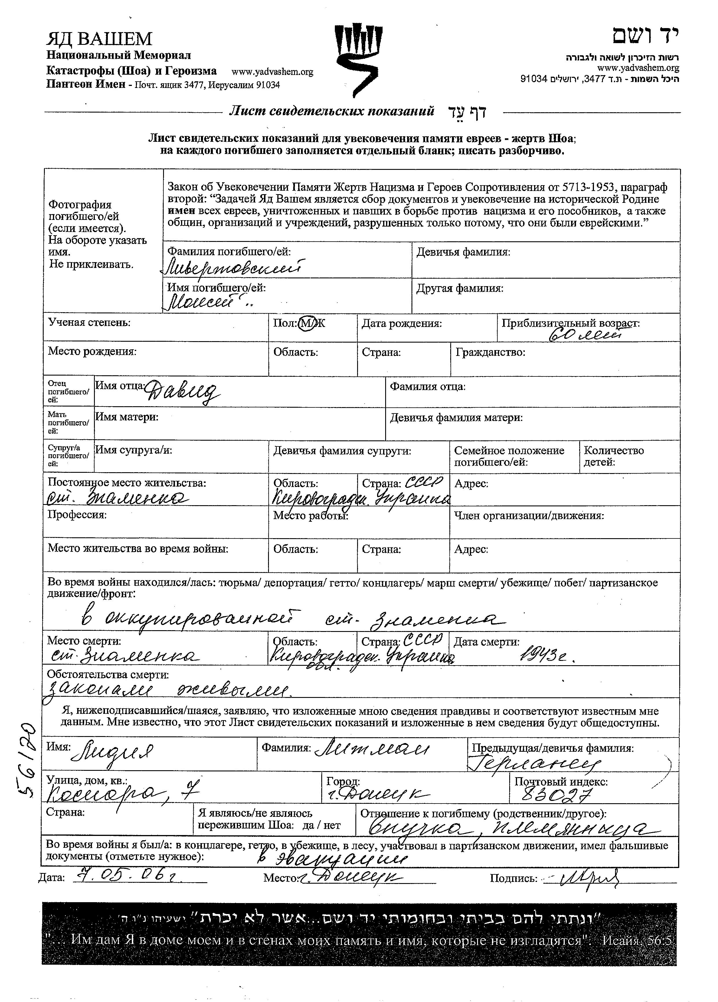 Livertovski Moisey Znamenka, Ukraine (USSR) Page of Testimony